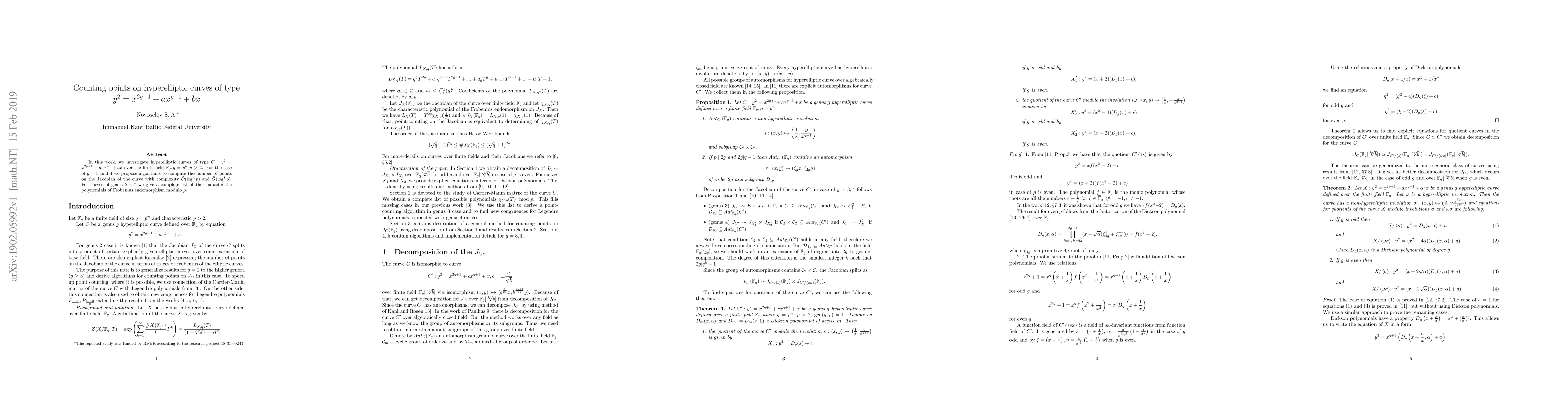 In this work, we investigate hyperelliptic curves of type $C: y^2 = x^{2g+1} + ax^{g+1} + bx$ over the finite field $\mathbb{F}_q, q = p^n, p > 2$. For the case of $g = 3$ and $4$ we propose algorithms to compute the number of points on the Jacobian of the curve with complexity $\tilde{O}(\log^4{p})$ and $\tilde{O}(\log^8{p})$. For curves of genus $2-7$ we give a complete list of the characteristic polynomials of Frobenius endomorphism modulo $p$.