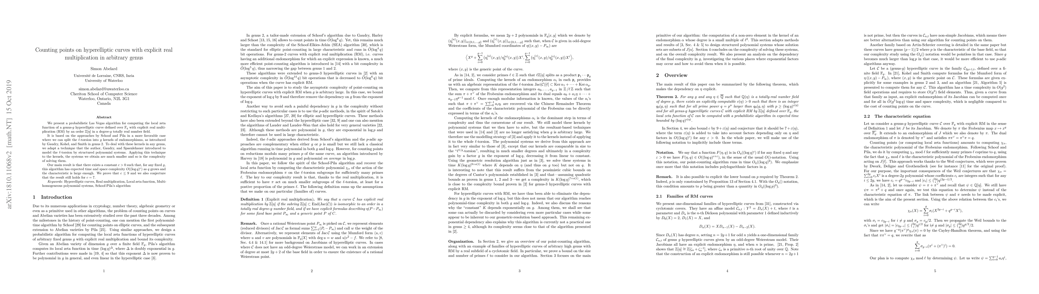 We present a probabilistic Las Vegas algorithm for computing the local zeta function of a genus-$g$ hyperelliptic curve defined over $\mathbb F_q$ with explicit real multiplication (RM) by an order $\Z[\eta]$ in a degree-$g$ totally real number field. It is based on the approaches by Schoof and Pila in a more favorable case where we can split the $\ell$-torsion into $g$ kernels of endomorphisms, as introduced by Gaudry, Kohel, and Smith in genus 2. To deal with these kernels in any genus, we adapt a technique that the author, Gaudry, and Spaenlehauer introduced to model the $\ell$-torsion by structured polynomial systems. Applying this technique to the kernels, the systems we obtain are much smaller and so is the complexity of solving them. Our main result is that there exists a constant $c>0$ such that, for any fixed $g$, this algorithm has expected time and space complexity $O((\log q)^{c})$ as $q$ grows and the characteristic is large enough. We prove that $c\le 9$ and we also conjecture that the result still holds for $c=7$.