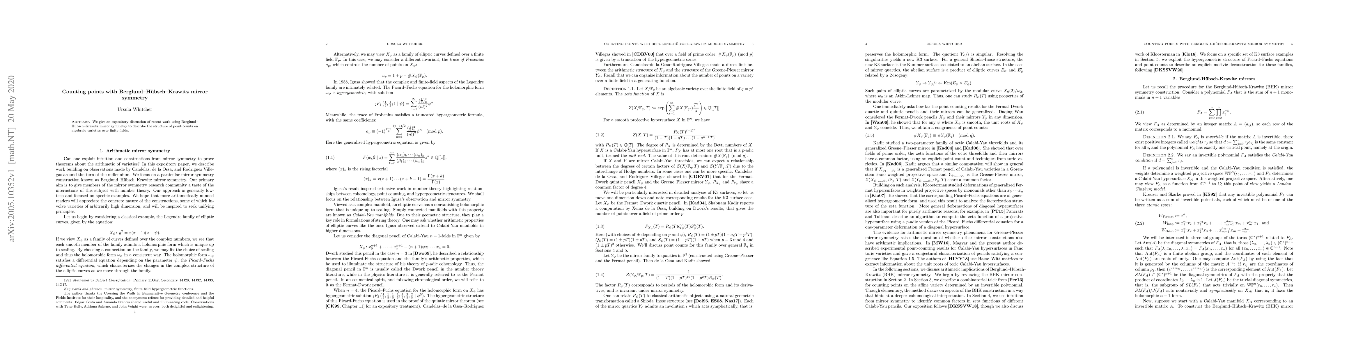 We give an expository discussion of recent work using Berglund-Huebsch-Krawitz mirror symmetry to describe the structure of point counts on algebraic varieties over finite fields.