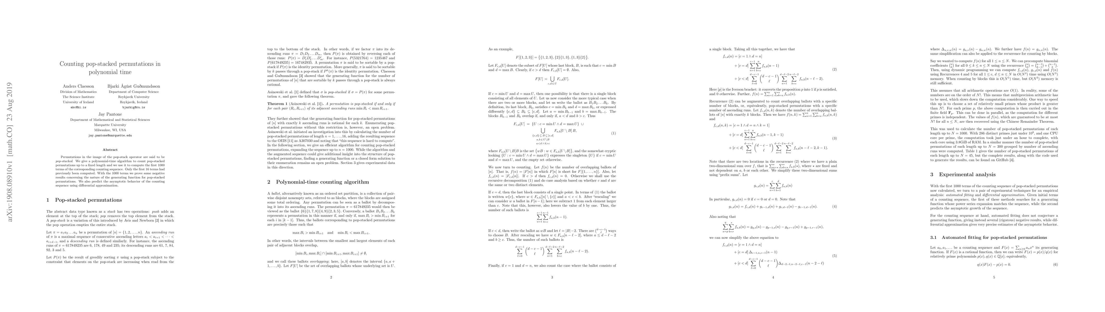 This paper presents a polynomial-time algorithm to count pop-stacked permutations, significantly extending previous computations to the first 1000 terms. It also uses the new data to derive negative results about the generating function and predicts the asymptotic behavior through differential approximation.