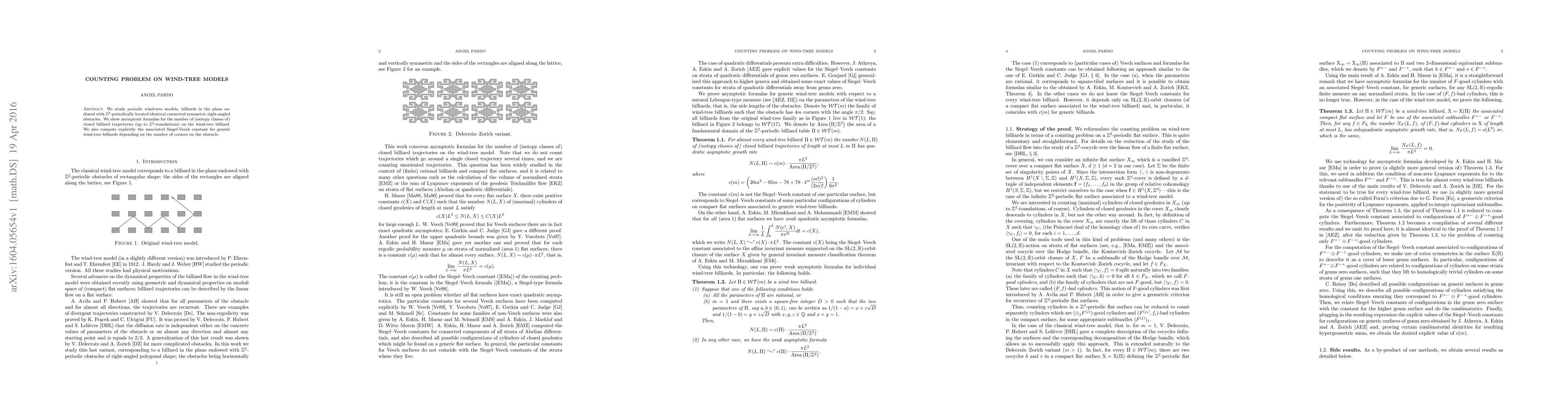 We study periodic wind-tree models, billiards in the plane endowed with $\mathbb{Z}^2$-periodically located identical connected symmetric right-angled obstacles. We show asymptotic formulas for the number of (isotopy classes of) closed billiard trajectories (up to $\mathbb{Z}^2$-translations) on the wind-tree billiard. We also compute explicitly the associated Siegel-Veech constant for generic wind-tree billiards depending on the number of corners on the obstacle.