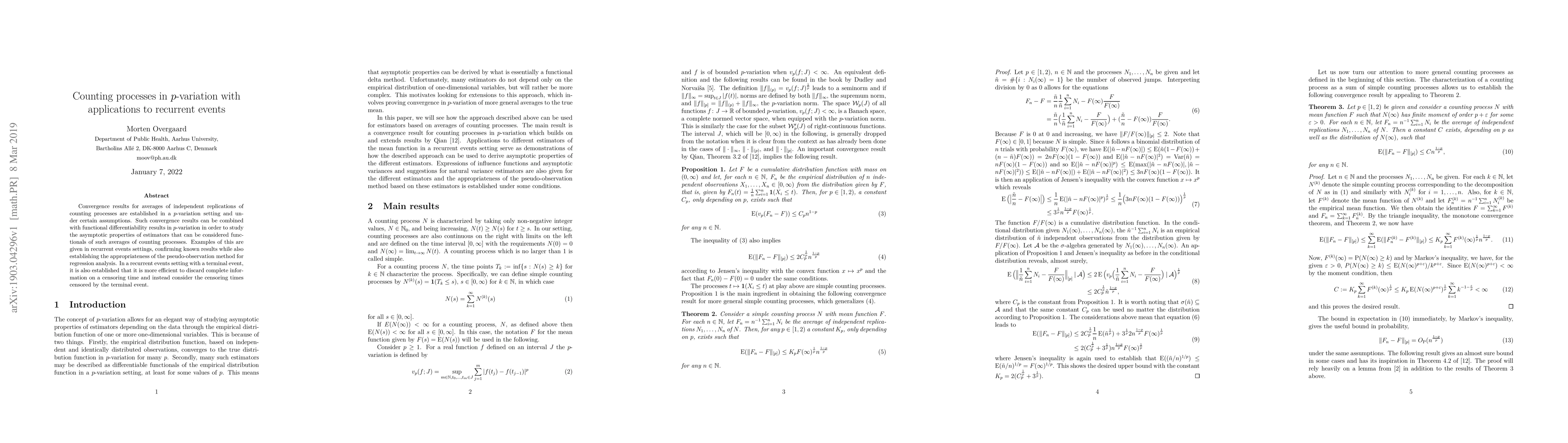 Convergence results for averages of independent replications of counting processes are established in a $p$-variation setting and under certain assumptions. Such convergence results can be combined with functional differentiability results in $p$-variation in order to study the asymptotic properties of estimators that can be considered functionals of such averages of counting processes. Examples of this are given in recurrent events settings, confirming known results while also establishing the appropriateness of the pseudo-observation method for regression analysis. In a recurrent events setting with a terminal event, it is also established that it is more efficient to discard complete information on a censoring time and instead consider the censoring times censored by the terminal event.