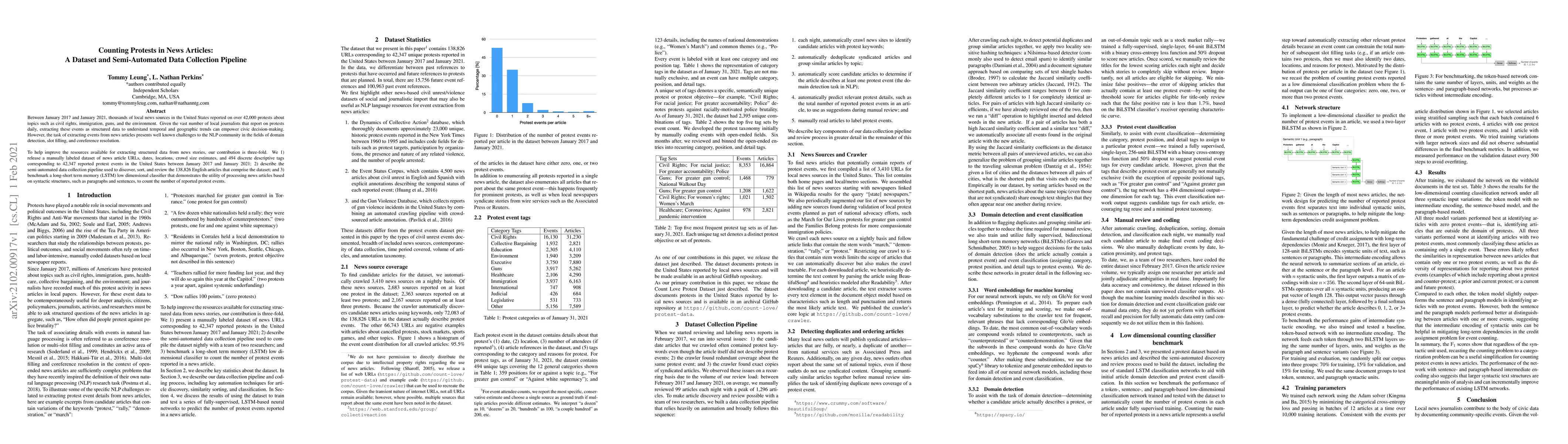 Between January 2017 and January 2021, thousands of local news sources in the United States reported on over 42,000 protests about topics such as civil rights, immigration, guns, and the environment. Given the vast number of local journalists that report on protests daily, extracting these events as structured data to understand temporal and geographic trends can empower civic decision-making. However, the task of extracting events from news articles presents well known challenges to the NLP community in the fields of domain detection, slot filling, and coreference resolution. To help improve the resources available for extracting structured data from news stories, our contribution is three-fold. We 1) release a manually labeled dataset of news article URLs, dates, locations, crowd size estimates, and 494 discrete descriptive tags corresponding to 42,347 reported protest events in the United States between January 2017 and January 2021; 2) describe the semi-automated data collection pipeline used to discover, sort, and review the 144,568 English articles that comprise the dataset; and 3) benchmark a long-short term memory (LSTM) low dimensional classifier that demonstrates the utility of processing news articles based on syntactic structures, such as paragraphs and sentences, to count the number of reported protest events.