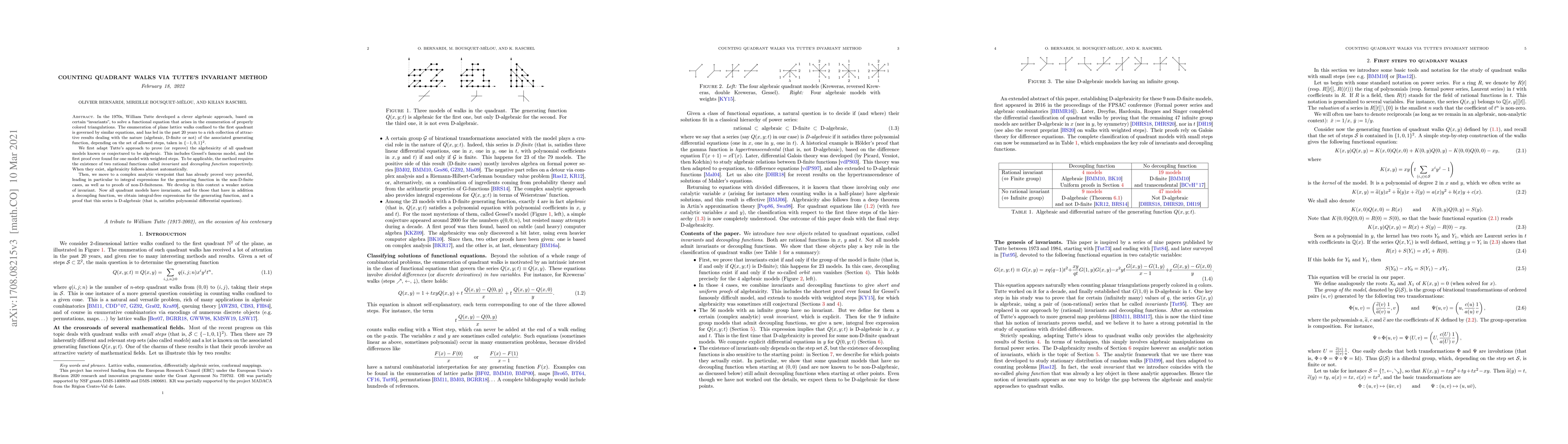 In the 1970s, William Tutte developed a clever algebraic approach, based on certain "invariants", to solve a functional equation that arises in the enumeration of properly colored triangulations. The enumeration of plane lattice walks confined to the first quadrant is governed by similar equations, and has led in the past 20 years to a rich collection of attractive results dealing with the nature (algebraic, D-finite or not) of the associated generating function, depending on the set of allowed steps, taken in $\{-1, 0,1\}^2$. We first adapt Tutte's approach to prove (or reprove) the algebraicity of all quadrant models known or conjectured to be algebraic. This includes Gessel's famous model, and the first proof ever found for one model with weighted steps. To be applicable, the method requires the existence of two rational functions called invariant and decoupling function respectively. When they exist, algebraicity follows almost automatically. Then, we move to a complex analytic viewpoint that has already proved very powerful, leading in particular to integral expressions for the generating function in the non-D-finite cases, as well as to proofs of non-D-finiteness. We develop in this context a weaker notion of invariant. Now all quadrant models have invariants, and for those that have in addition a decoupling function, we obtain integral-free expressions for the generating function, and a proof that this series is D-algebraic (that is, satisfies polynomial differential equations).