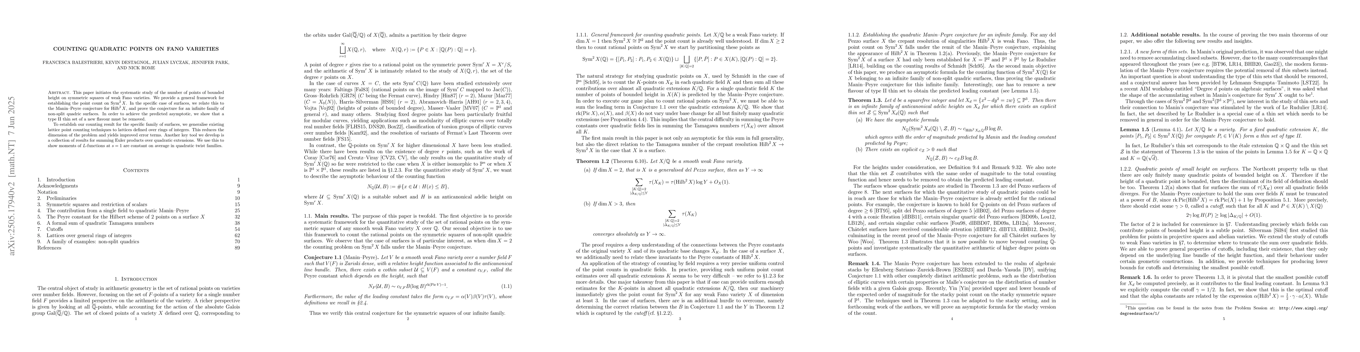 This paper initiates the systematic study of the number of points of bounded height on symmetric squares of weak Fano varieties. We provide a general framework for establishing the point count on $\text{Sym}^2 X$. In the specific case of surfaces, we relate this to the Manin--Peyre conjecture for $\text{Hilb}^2 X$, and prove the conjecture for an infinite family of non-split quadric surfaces. In order to achieve the predicted asymptotic, we show that a type II thin set of a new flavour must be removed. To establish our counting result for the specific family of surfaces, we generalise existing lattice point counting techniques to lattices defined over rings of integers. This reduces the dimension of the problem and yields improved error terms. Another key tool we develop is a collection of results for summing Euler products over quadratic extensions. We use this to show moments of $L$-functions at $s=1$ are constant on average in quadratic twist families.