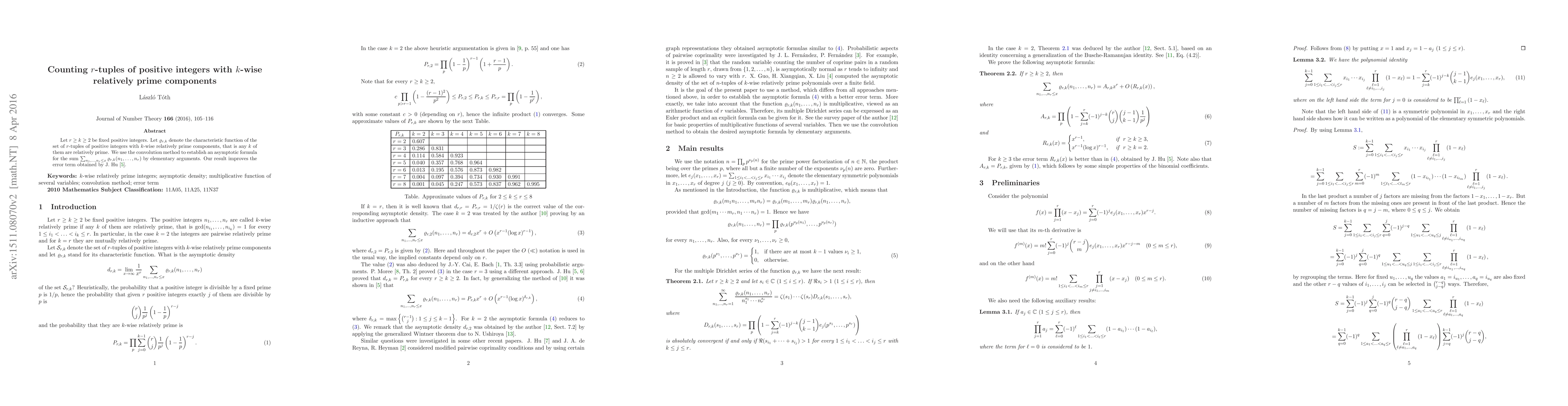 This paper establishes an asymptotic formula for counting $r$-tuples of positive integers where any $k$ components are relatively prime, improving upon the error term previously obtained by J. Hu (2013) using the convolution method.