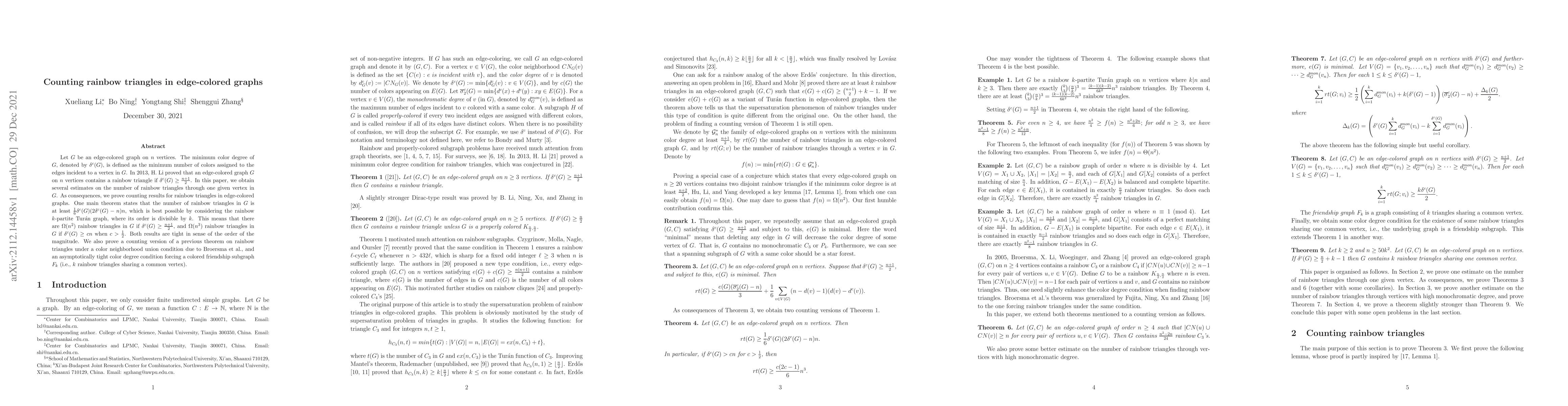 The paper introduces and proves several theorems and lemmas providing estimates and bounds on the number of rainbow triangles in edge-colored graphs, extending previous work by H. Li.