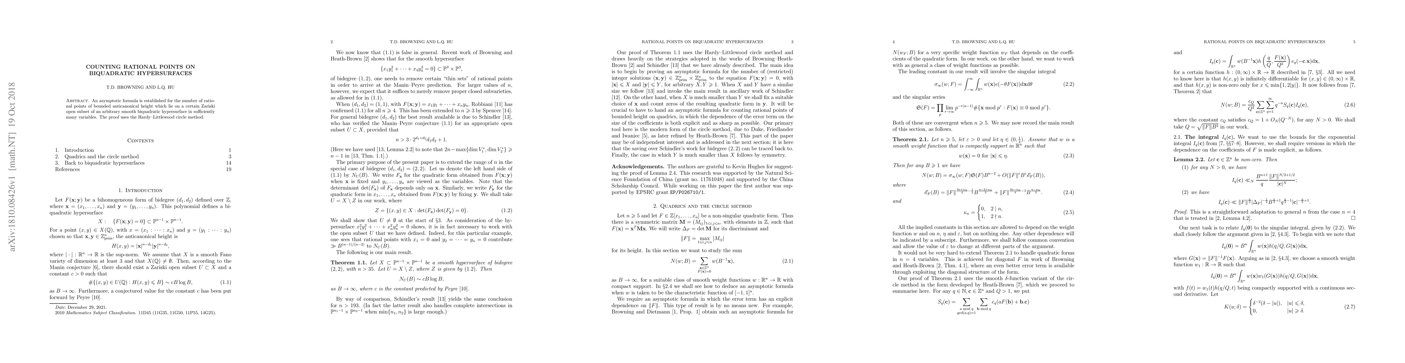 This paper establishes an asymptotic formula for the number of rational points on a Zariski open subset of a smooth biquadratic hypersurface, using the Hardy-Littlewood circle method to account for bounded anticanonical height. The result applies to hypersurfaces in sufficiently many variables.