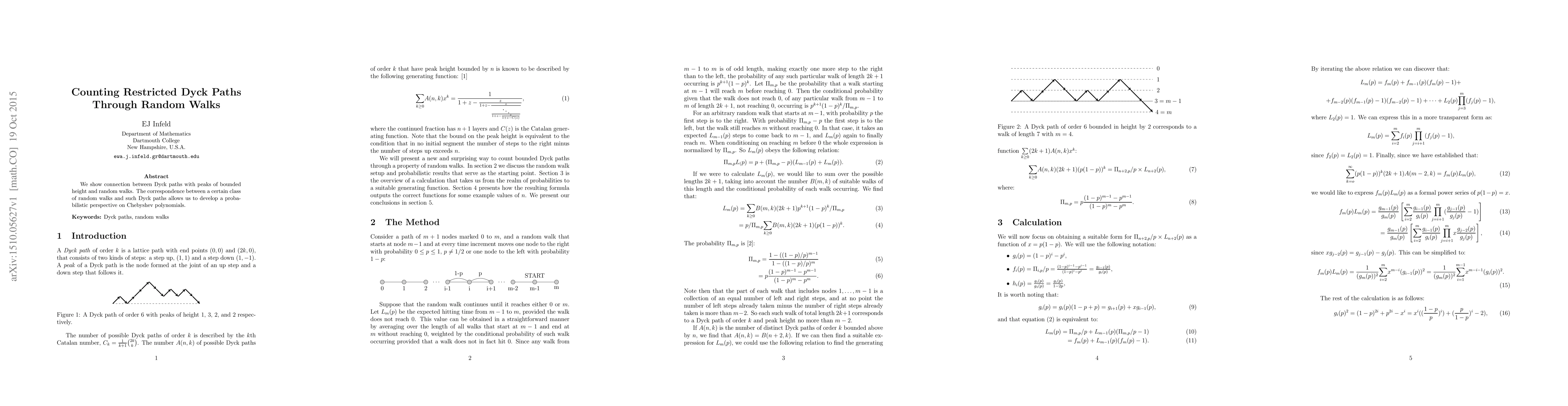 Summary: This paper establishes a link between Dyck paths with restricted peak heights and specific random walks, enabling a probabilistic approach to understanding Chebyshev polynomials through this correspondence.