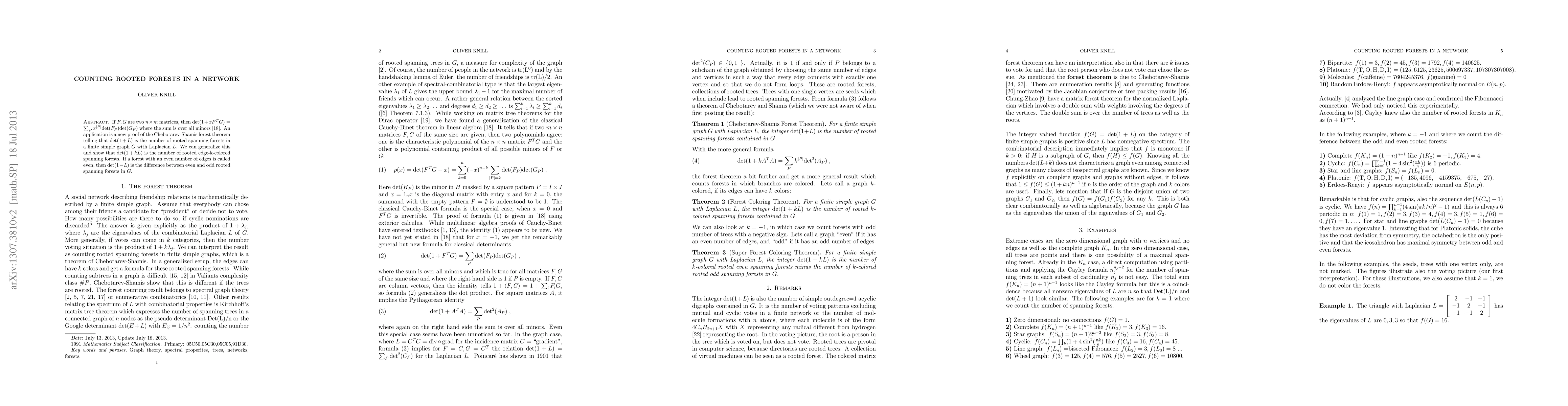 This paper provides a new proof of the Chebotarev-Shamis forest theorem using a generalized Cauchy-Binet theorem, showing that det(1+L) counts rooted spanning forests in a graph G. It extends this result to det(1+kL) for k-colored spanning forests and det(1-L) for the difference between even and odd rooted spanning forests.