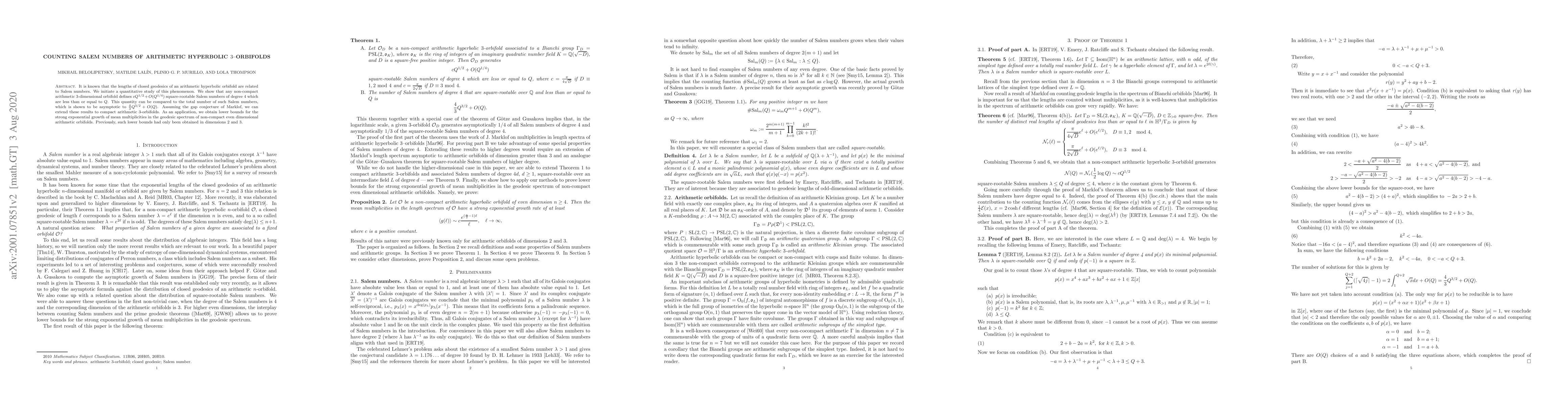 It is known that the lengths of closed geodesics of an arithmetic hyperbolic orbifold are related to Salem numbers. We initiate a quantitative study of this phenomenon. We show that any non-compact arithmetic $3$-dimensional orbifold defines $c Q^{1/2} + O(Q^{1/4})$ square-rootable Salem numbers of degree $4$ which are less than or equal to $Q$. This quantity can be compared to the total number of such Salem numbers, which is shown to be asymptotic to $\frac{4}{3}Q^{3/2}+O(Q)$. Assuming the gap conjecture of Marklof, we can extend these results to compact arithmetic $3$-orbifolds. As an application, we obtain lower bounds for the strong exponential growth of mean multiplicities in the geodesic spectrum of non-compact even dimensional arithmetic orbifolds. Previously, such lower bounds had only been obtained in dimensions $2$ and $3$.