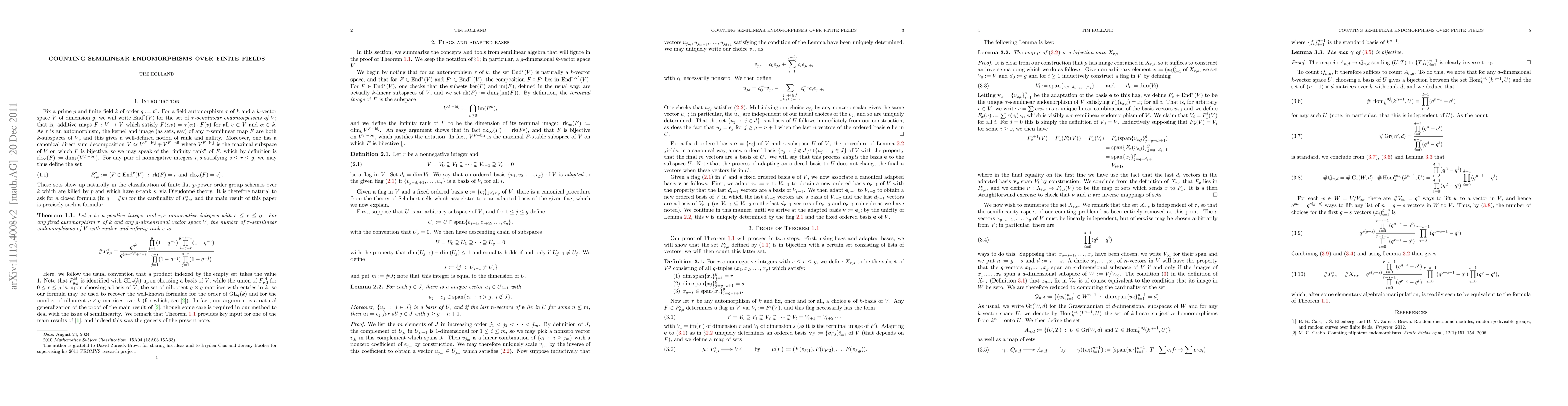 This paper counts the number of semilinear endomorphisms of a g-dimensional vector space over a finite field k, focusing on those with specified rank r and stable rank s. These endomorphisms are significant in classifying certain finite flat group schemes via Dieudonne theory.