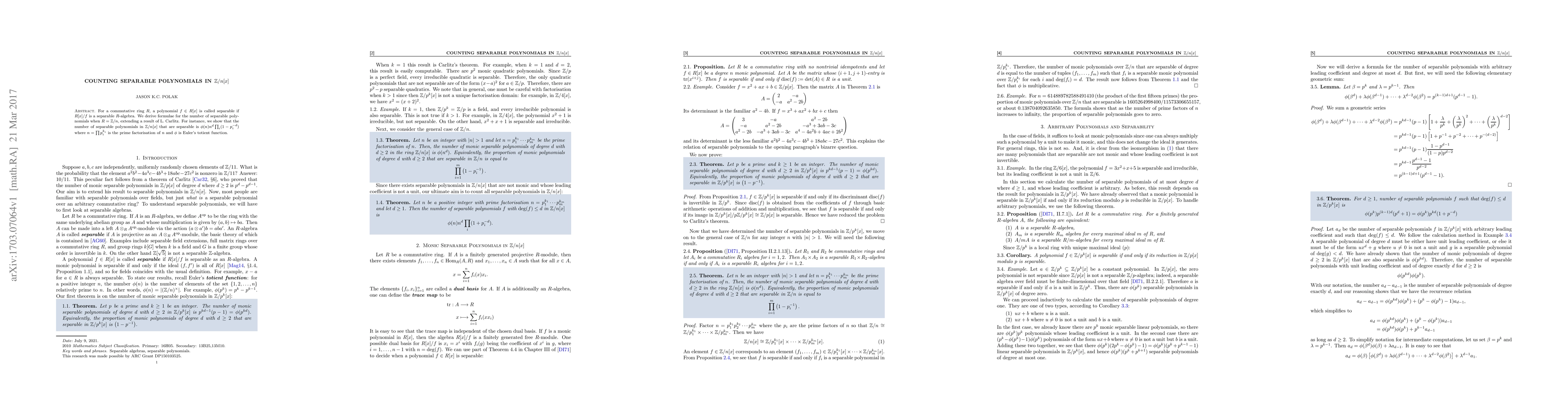 For a commutative ring $R$, a polynomial $f\in R[x]$ is called separable if $R[x]/f$ is a separable $R$-algebra. We derive formulae for the number of separable polynomials when $R = \mathbb{Z}/n$, extending a result of L. Carlitz. For instance, we show that the number of separable polynomials in $\mathbb{Z}/n[x]$ that are separable is $\phi(n)n^d\prod_i(1-p_i^{-d})$ where $n = \prod p_i^{k_i}$ is the prime factorisation of $n$ and $\phi$ is Euler's totient function.