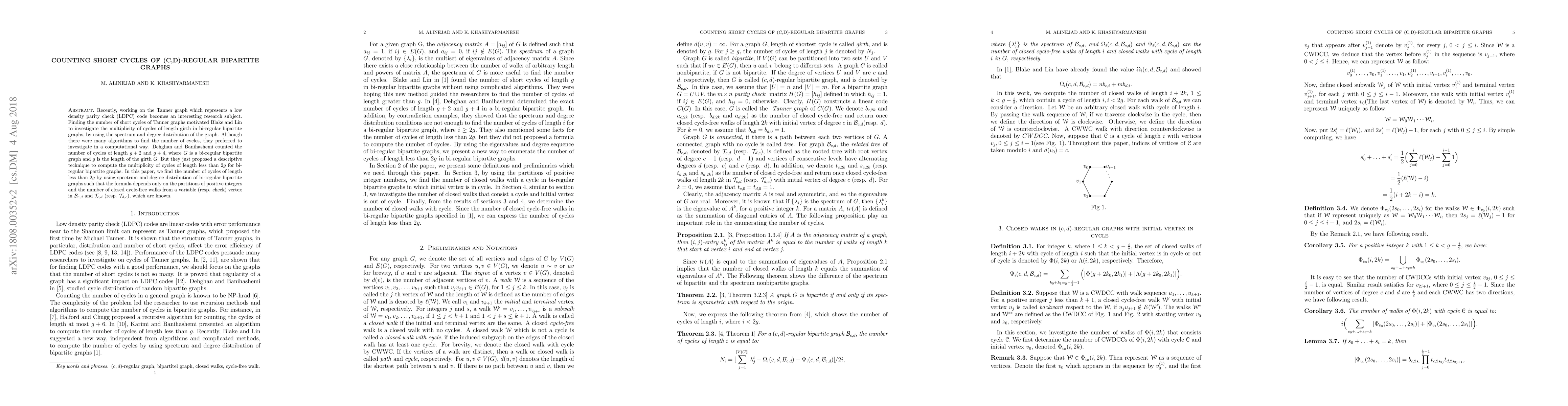 This paper develops a computational method to count the number of short cycles in (c,d)-regular bipartite graphs using the graph's spectrum and degree distribution. It provides a formula that relies on partitions of positive integers and the number of closed cycle-free walks, enhancing the understanding of cycle multiplicity in Tanner graphs used in LDPC codes.