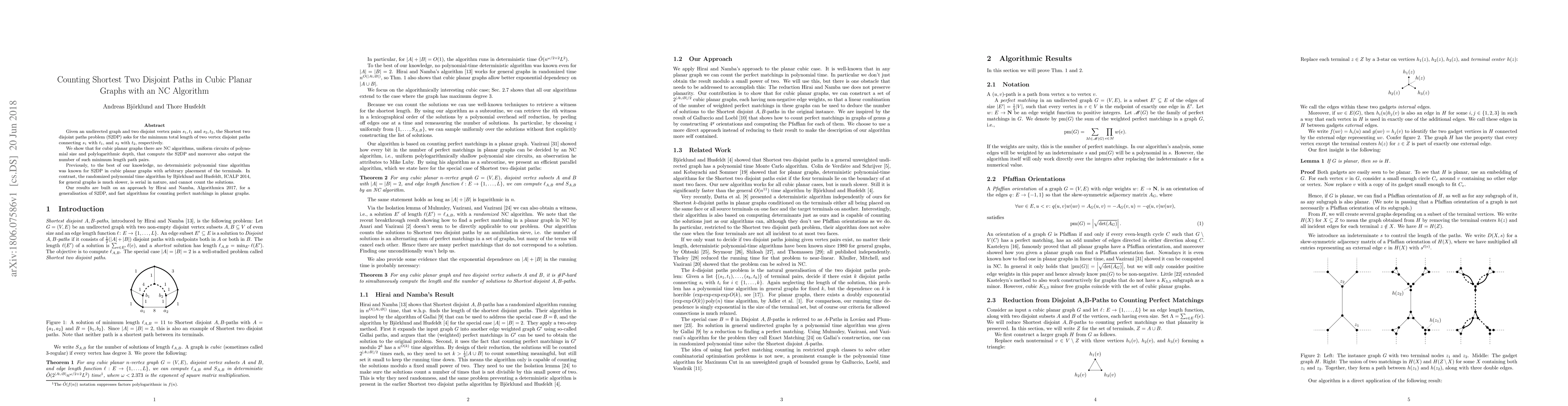 This paper presents NC algorithms for computing the Shortest two disjoint paths problem (S2DP) in cubic planar graphs, providing both the minimum path length and the count of such paths. Prior to this work, no deterministic polynomial time algorithm existed for S2DP in such graphs.