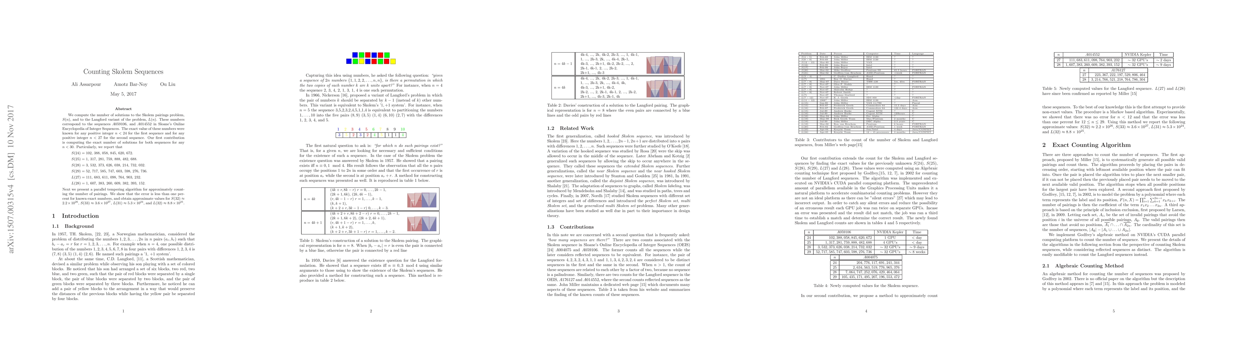 We compute the number of solutions to the Skolem pairings problem, S(n), and to the Langford variant of the problem, L(n). These numbers correspond to the sequences A059106, and A014552 in Sloane's Online Encyclopedia of Integer Sequences. The exact value of these numbers were known for any positive integer n < 24 for the first sequence and for any positive integer n < 27 for the second sequence. Our first contribution is computing the exact number of solutions for both sequences for any n < 30. Particularly, we report that S(24) = 102, 388, 058, 845, 620, 672. S(25) = 1, 317, 281, 759, 888, 482, 688. S(28) = 3, 532, 373, 626, 038, 214, 732, 032. S(29) = 52, 717, 585, 747, 603, 598, 276, 736. L(27) = 111, 683, 611, 098, 764, 903, 232. L(28) = 1, 607, 383, 260, 609, 382, 393, 152. Next we present a parallel tempering algorithm for approximately counting the number of pairings. We show that the error is less than one percent for known exact numbers, and obtain approximate values for S(32) ~ 2.2x10^26 , S(33) ~ 3.6x10^27, L(31) ~ 5.3x10^24, and L(32) ~ 8.8x10^25