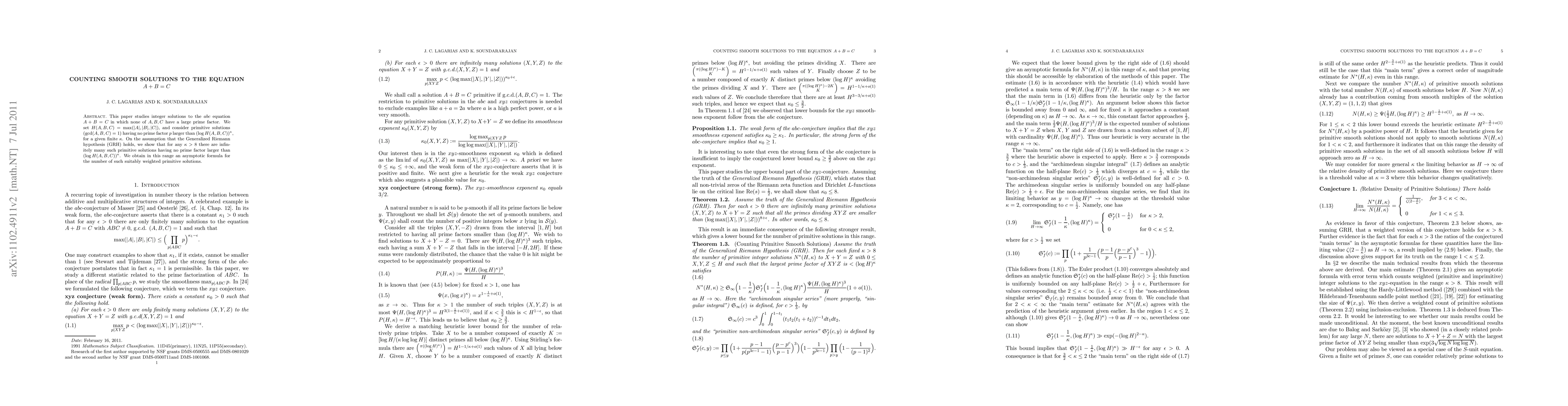 This paper studies integer solutions to the Diophantine equation A+B=C in which none of A, B, C have a large prime factor. We set H(A, B,C) = max(|A|, |B|, |C|), and consider primitive solutions (gcd}(A, B, C)=1) having no prime factor p larger than (log H(A, B,C))^K, for a given finite K. On the assumption that the Generalized Riemann hypothesis (GRH) holds, we show that for any K > 8 there are infinitely many such primitive solutions having no prime factor larger than (log H(A, B, C))^K. We obtain in this range an asymptotic formula for the number of such suitably weighted primitive solutions.