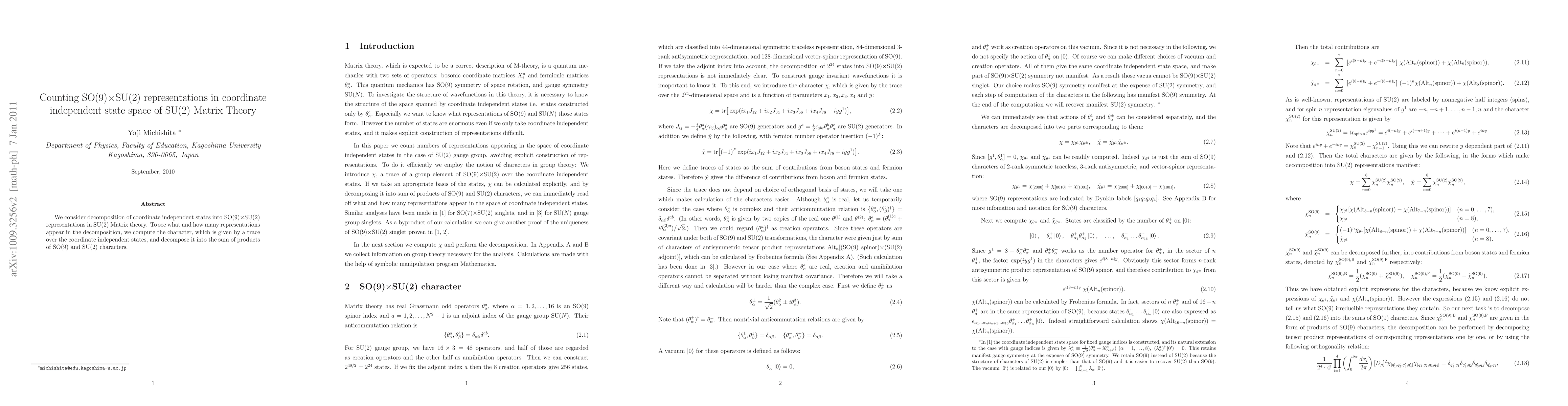 Researchers investigate how coordinate-independent states in SU(2) Matrix theory decompose into representations of SO(9)xSU(2), revealing key characteristics of these representations through character computation.