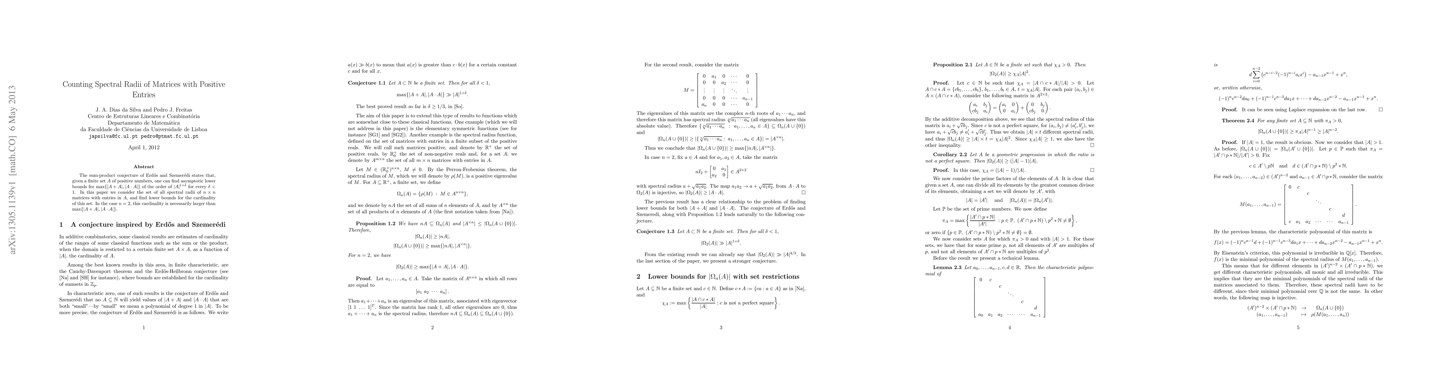 The sum-product conjecture of Erd\H os and Szemer\'edi states that, given a finite set $A$ of positive numbers, one can find asymptotic lower bounds for $\max\{|A+A|,|A\cdot A|\}$ of the order of $|A|^{1+\delta}$ for every $\delta <1$. In this paper we consider the set of all spectral radii of $n\times n$ matrices with entries in $A$, and find lower bounds for the cardinality of this set. In the case $n=2$, this cardinality is necessarily larger than $\max\{|A+A|,|A\cdot A|\}$.