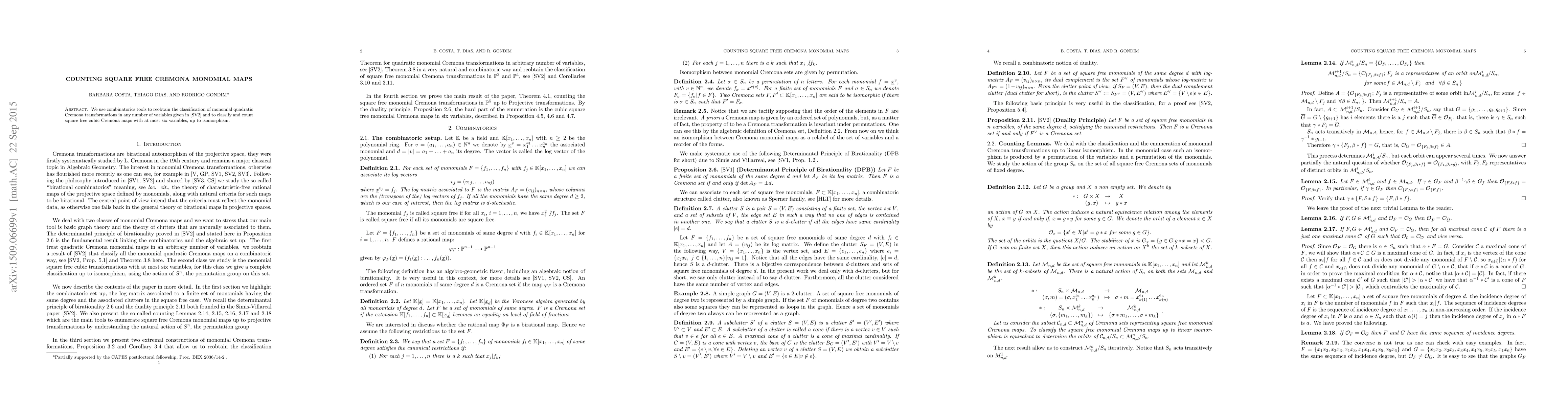 We use combinatorics tools to reobtain the classification of monomial quadratic Cremona transformations in any number of variables given in \cite{SV2} and to classify and count square free cubic Cremona maps with at most six variables, up to isomorphism.