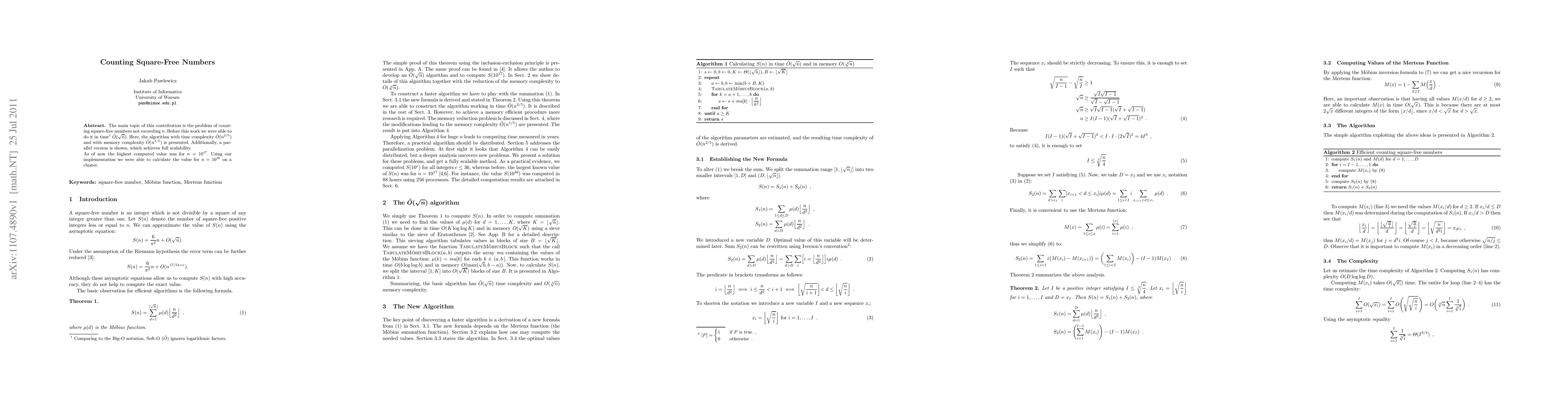 The main topic of this contribution is the problem of counting square-free numbers not exceeding $n$. Before this work we were able to do it in time (Comparing to the Big-O notation, Soft-O ($\softO$) ignores logarithmic factors) $\softO(\sqrt{n})$. Here, the algorithm with time complexity $\softO(n^{2/5})$ and with memory complexity $\softO(n^{1/5})$ is presented. Additionally, a parallel version is shown, which achieves full scalability. As of now the highest computed value was for $n=10^{17}$. Using our implementation we were able to calculate the value for $n=10^{36}$ on a cluster.