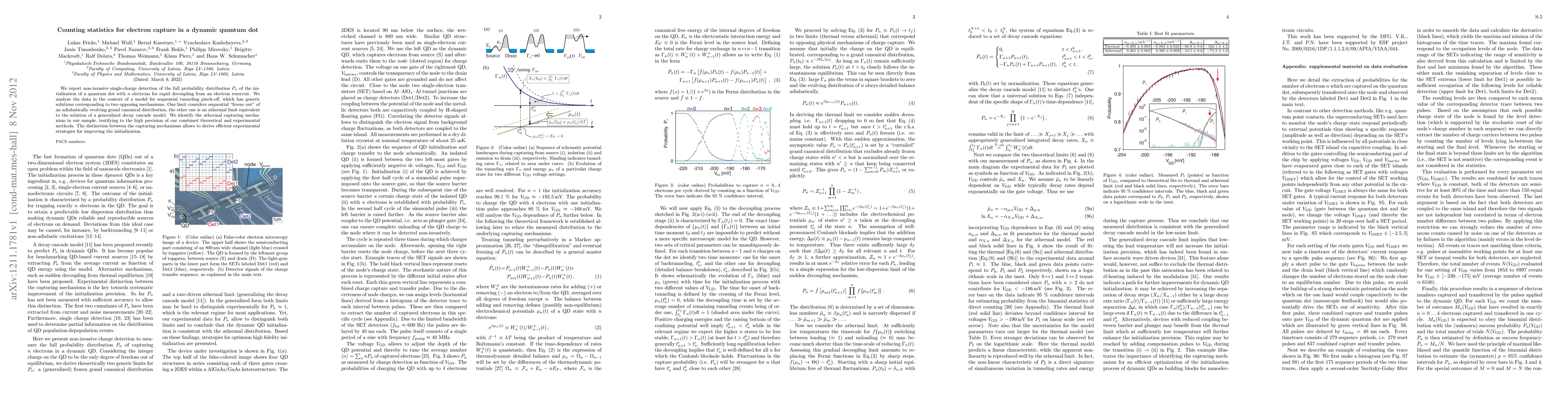 We report non-invasive single-charge detection of the full probability distribution $P_n$ of the initialization of a quantum dot with $n$ electrons for rapid decoupling from an electron reservoir. We analyze the data in the context of a model for sequential tunneling pinch-off, which has generic solutions corresponding to two opposing mechanisms. One limit considers sequential "freeze out" of an adiabatically evolving grand canonical distribution, the other one is an athermal limit equivalent to the solution of a generalized decay cascade model. We identify the athermal capturing mechanism in our sample, testifying to the high precision of our combined theoretical and experimental methods. The distinction between the capturing mechanisms allows to derive efficient experimental strategies for improving the initialization.