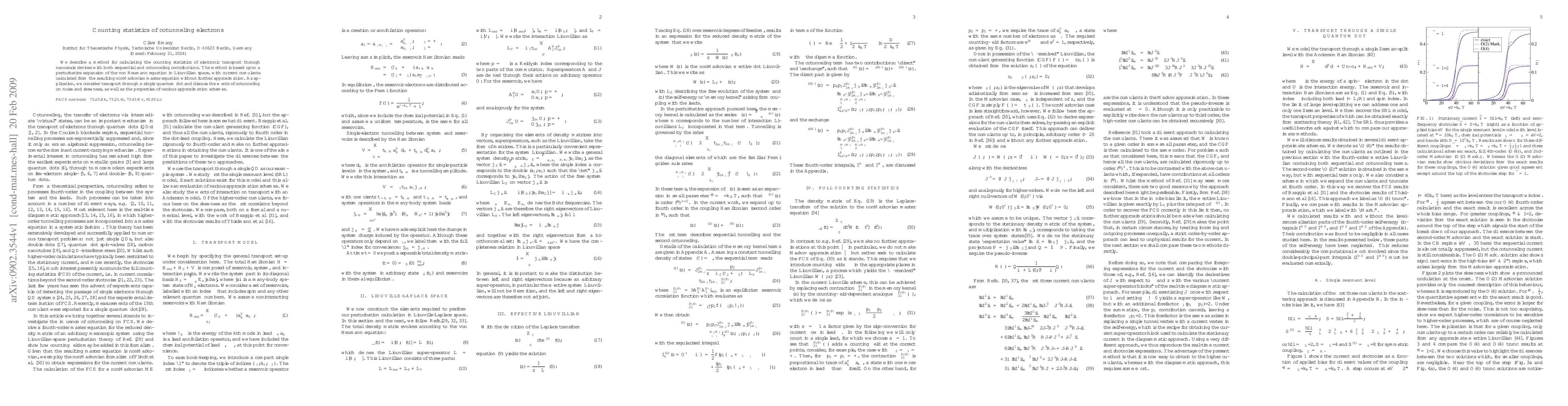 A perturbative expansion of the von Neumann equation in Liouvillian space was used to calculate current cumulants from a nonMarkovian master equation.
