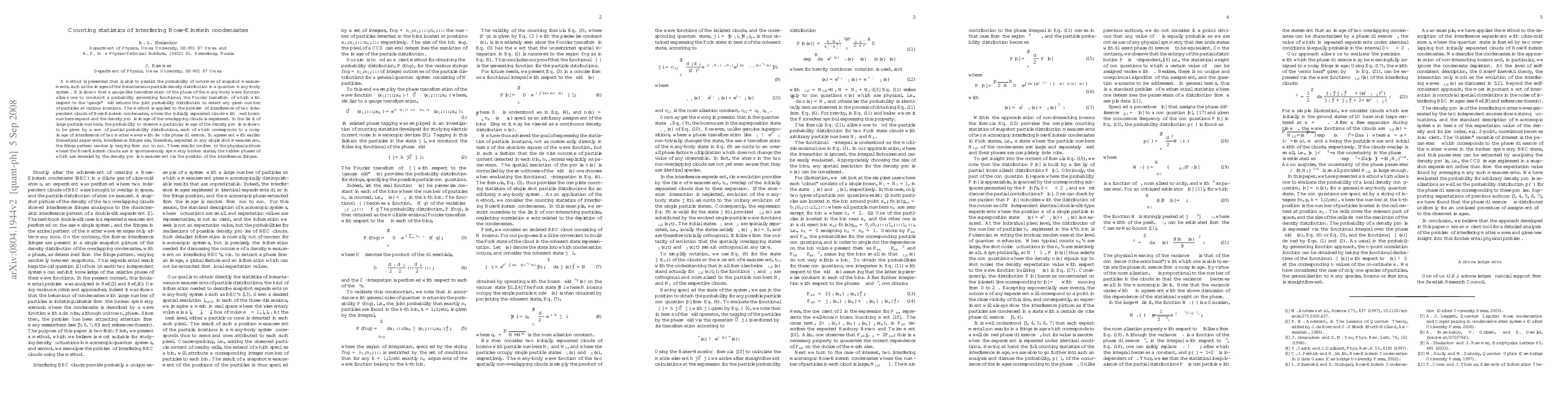 A method is presented that is able to predict the probability of outcomes of snapshot measurements, such as the images of the instantaneous particle density distribution in a quantum many-body system. It is shown that a gauge-like transformation of the phase of the many-body wave function allows one to construct a probability generating functional, the Fourier transform of which with respect to the "gauge" field returns the joint probability distribution to detect any given number of particles at various locations. The method is applied to the problem of interference of two independent clouds of Bose-Einstein condensates, where the initially separated clouds with fixed boson numbers expand and the density profile image of the overlapping clouds is registered. In the limit of large particle numbers, the probability to observe a particular image of the density profile is shown to be given by a sum of partial probability distributions, each of which corresponds to a noisy image of interference of two matter waves with definite phase difference. In agreement with earlier theoretical arguments, interference fringes are, therefore, expected in any single shot measurement, the fringe pattern randomly varying from run to run. These results conform to the physical picture where the Bose-Einstein clouds are in spontaneously symmetry broken states, the hidden phases of which are revealed by the density profile measurement via the position of the interference fringes.