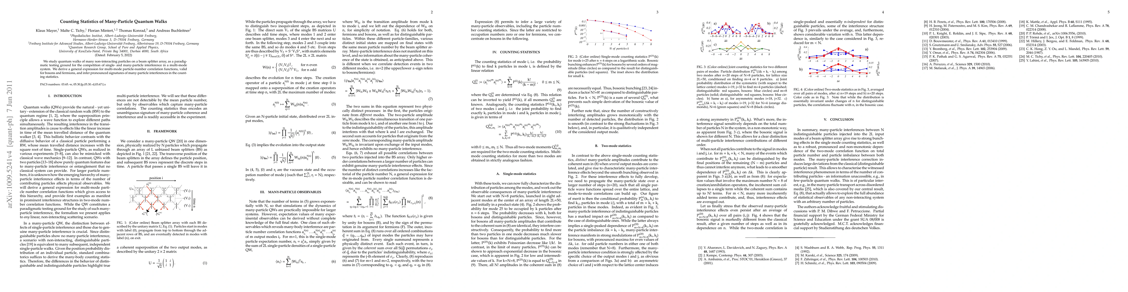 This paper investigates quantum walks of many non-interacting particles in a beam splitter array, deriving expressions for multi-mode particle-number correlation functions for both bosons and fermions, and highlighting significant many-particle interference signatures in the counting statistics.