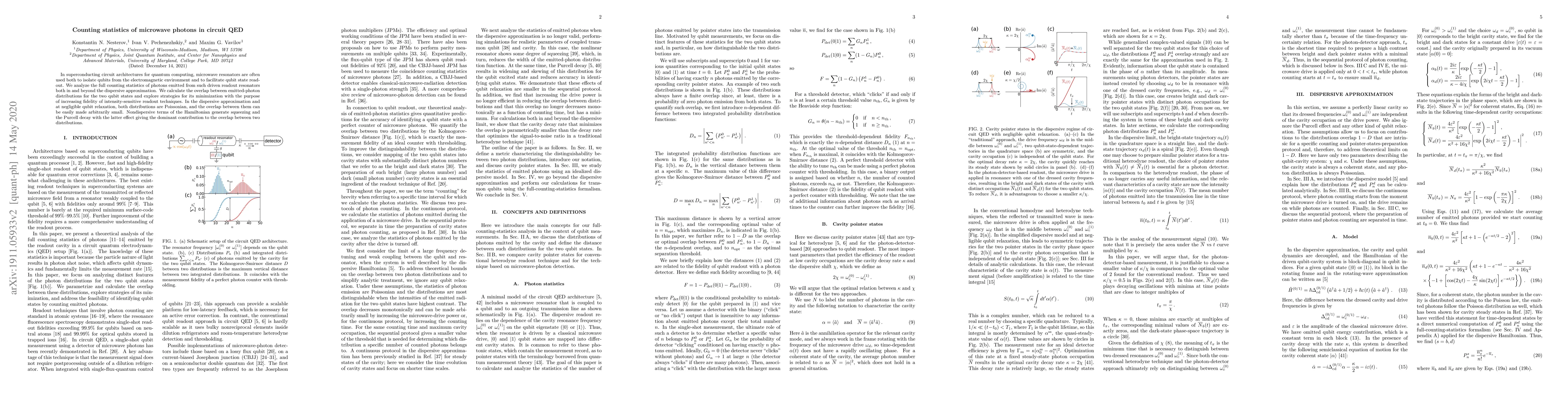 This paper investigates the full counting statistics of microwave photons in superconducting circuit quantum electrodynamics (QED) systems, focusing on driven readout resonators. It finds that while the dispersive approximation yields Poissonian photon distributions with minimal overlap, nondispersive terms introduce squeezing and Purcell decay, which significantly affect the overlap and readout fidelity.