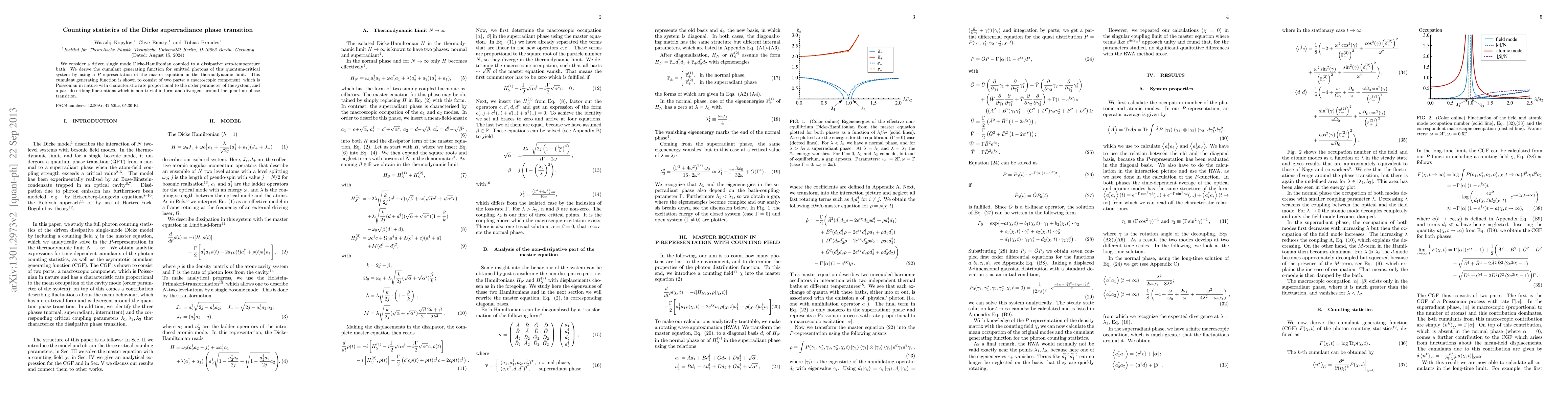 We consider a driven single mode Dicke-Hamiltonian coupled to a dissipative zero-temperature bath. We derive the cumulant generating function for emitted photons of this quantum-critical system by using a $P$-representation of the master equation in the thermodynamic limit. This cumulant generating function is shown to consist of two parts: a macroscopic component, which is Poissonian in nature with characteristic rate proportional to the order parameter of the system; and a part describing fluctuations which is non-trivial in form and divergent around the quantum phase transition.