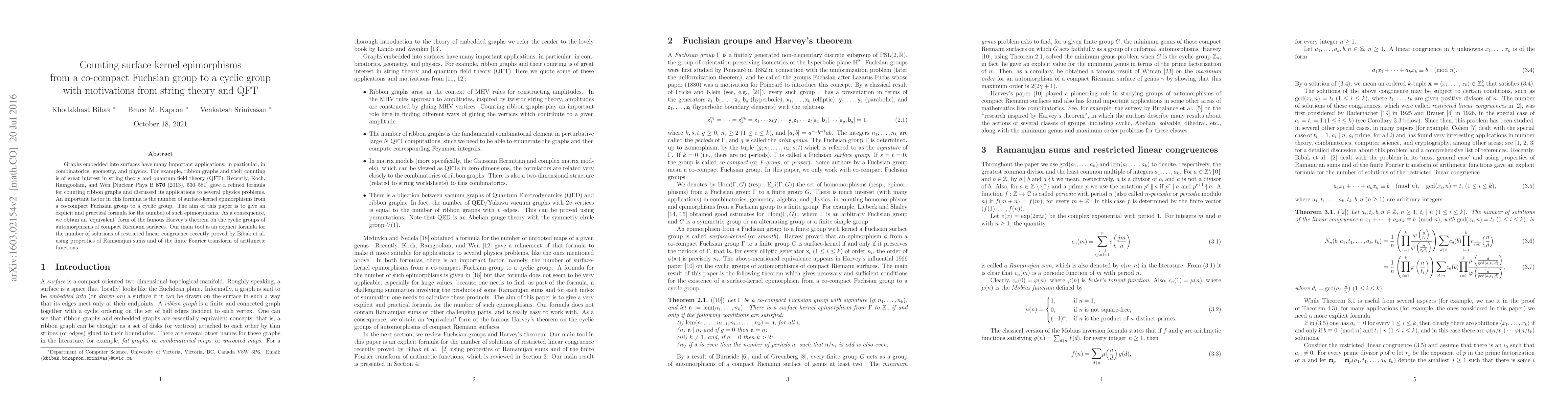 Graphs embedded into surfaces have many important applications, in particular, in combinatorics, geometry, and physics. For example, ribbon graphs and their counting is of great interest in string theory and quantum field theory (QFT). Recently, Koch, Ramgoolam, and Wen [Nuclear Phys.\,B {\bf 870} (2013), 530--581] gave a refined formula for counting ribbon graphs and discussed its applications to several physics problems. An important factor in this formula is the number of surface-kernel epimorphisms from a co-compact Fuchsian group to a cyclic group. The aim of this paper is to give an explicit and practical formula for the number of such epimorphisms. As a consequence, we obtain an `equivalent' form of the famous Harvey's theorem on the cyclic groups of automorphisms of compact Riemann surfaces. Our main tool is an explicit formula for the number of solutions of restricted linear congruence recently proved by Bibak et al. using properties of Ramanujan sums and of the finite Fourier transform of arithmetic functions.