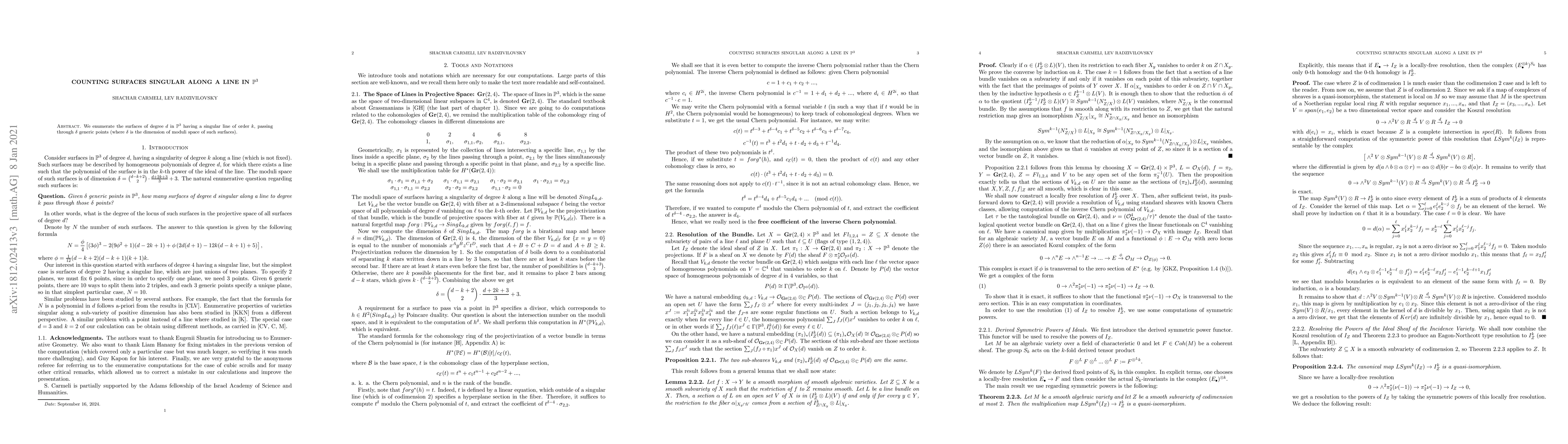 We enumerate the number of surfaces of degree $d$ in $P^3$ having a singular line of order $k$, passing through $\delta$ generic points (where $\delta$ is the dimension of moduli space of such surfaces).