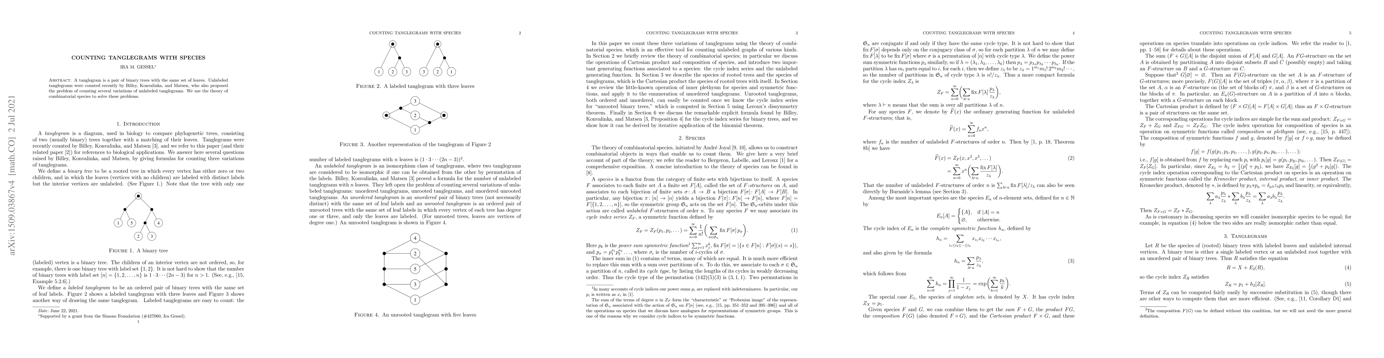 This paper employs combinatorial species theory to count various types of unlabeled tanglegrams, including unordered and unrooted variations, building on previous work by Billey, Konvalinka, and Matsen. The method provides a systematic approach to enumerate these complex tree structures.