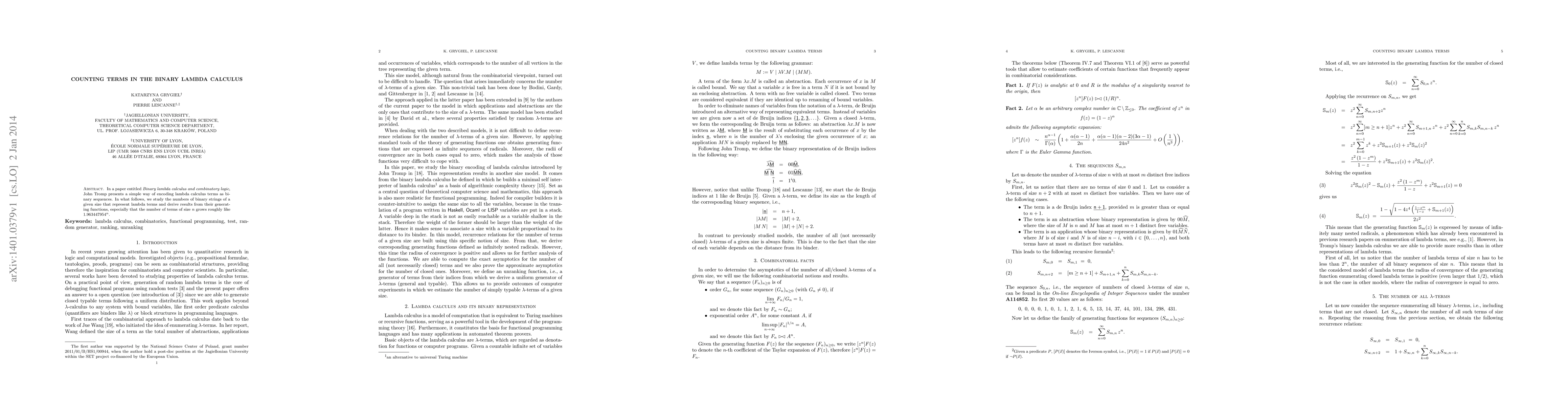 This paper investigates the enumeration of lambda calculus terms encoded as binary sequences, revealing that the number of such terms of size n grows approximately exponentially with a base of 1.963447954. The study is grounded in the encoding method introduced by John Tromp.