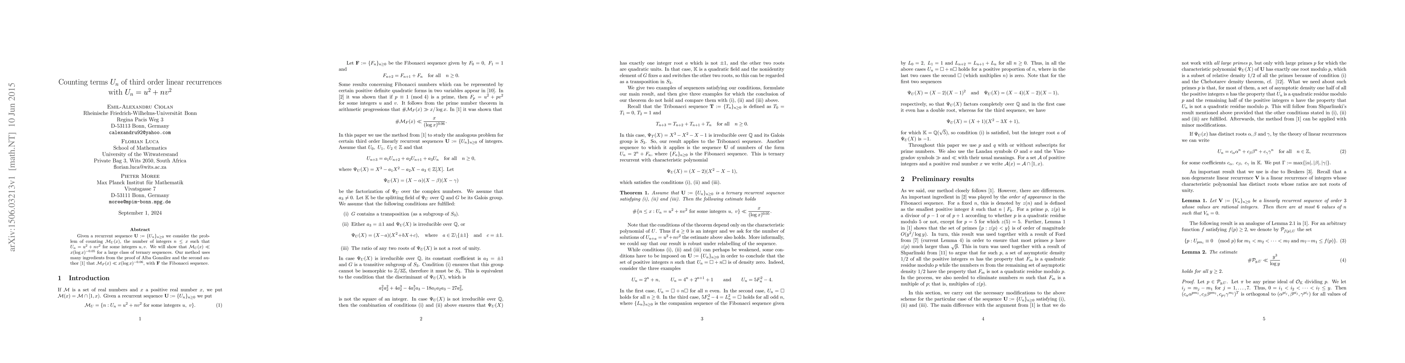 Given a recurrent sequence ${\bf U}:=\{U_n\}_{n\ge 0}$ we consider the problem of counting ${\mathcal M}_U(x)$, the number of integers $n\le x$ such that $U_n=u^2+nv^2$ for some integers $u,v$. We will show that ${\mathcal M}_U(x)\ll x(\log x)^{-0.05}$ for a large class of ternary sequences. Our method uses many ingredients from the proof of Alba Gonz\'alez and the second author that ${\mathcal M}_F(x)\ll x(\log x)^{-0.06}$, with $\bf F$ the Fibonacci sequence.