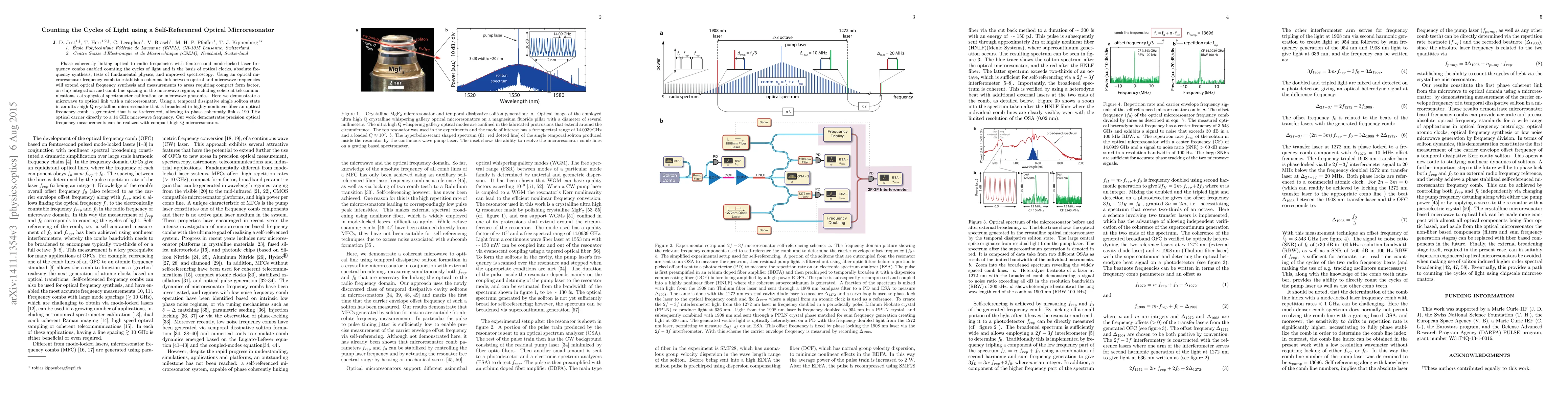 This paper demonstrates a self-referenced optical microresonator frequency comb to establish a phase coherent link between optical and microwave frequencies, enabling precise optical frequency measurements and applications in telecommunications and astrophysics. The method utilizes a temporal dissipative soliton in a crystalline microresonator, generating a comb that directly connects a 190 THz optical carrier to a 14 GHz microwave frequency.