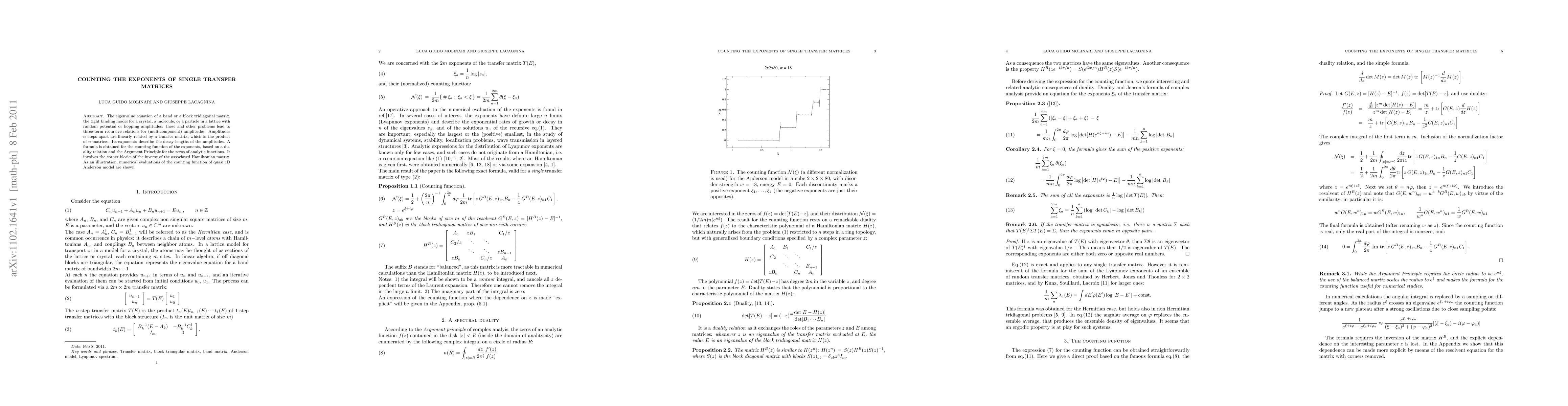 The eigenvalue equation of a band or a block tridiagonal matrix, the tight binding model for a crystal, a molecule, or a particle in a lattice with random potential or hopping amplitudes: these and other problems lead to three-term recursive relations for (multicomponent) amplitudes. Amplitudes n steps apart are linearly related by a transfer matrix, which is the product of n matrices. Its exponents describe the decay lengths of the amplitudes. A formula is obtained for the counting function of the exponents, based on a duality relation and the Argument Principle for the zeros of analytic functions. It involves the corner blocks of the inverse of the associated Hamiltonian matrix. As an illustration, numerical evaluations of the counting function of quasi 1D Anderson model are shown.