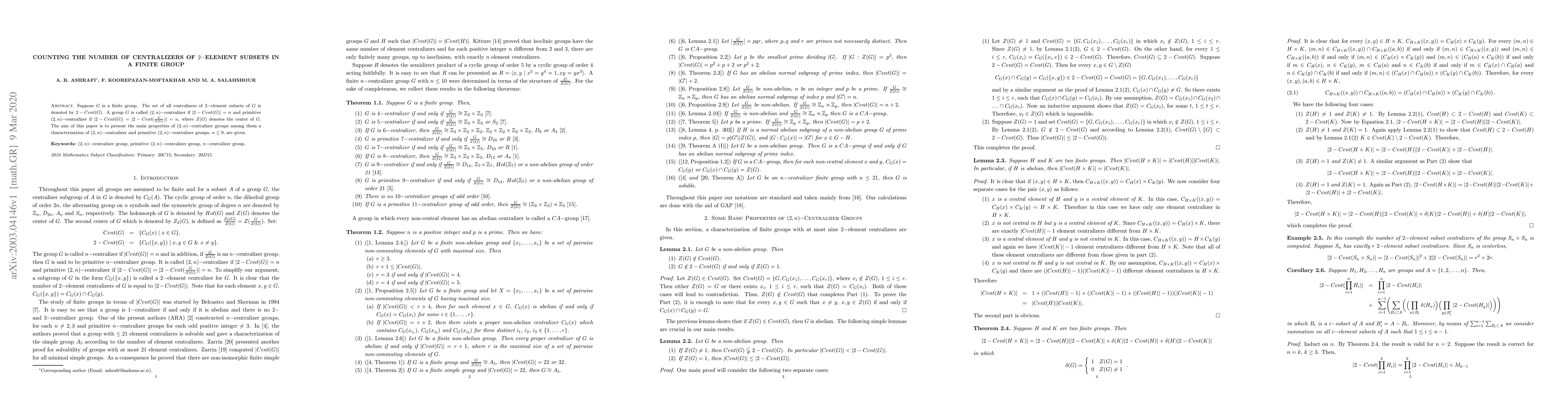 Suppose $G$ is a finite group. The set of all centralizers of $2-$element subsets of $G$ is denoted by $2-Cent(G)$. A group $G$ is called $(2,n)-$centralizer if $|2-Cent(G)| = n$ and primitive $(2,n)-$centralizer if $|2-Cent(G)| = |2-Cent(\frac{G}{Z(G)})| = n$, where $Z(G)$ denotes the center of $G$. The aim of this paper is to present the main properties of $(2,n)-$centralizer groups among them a characterization of $(2,n)-$centralizer and primitive $(2,n)-$centralizer groups, $n \leq 9$, are given.