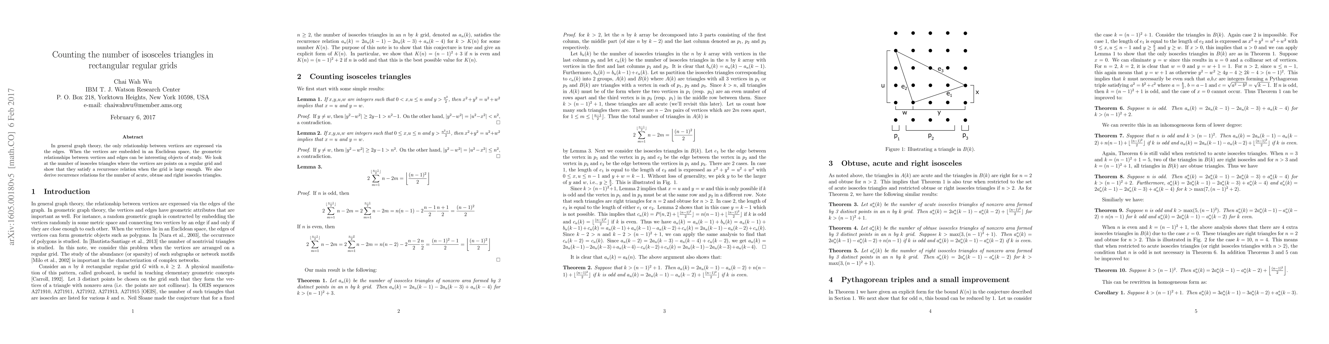 In general graph theory, the only relationship between vertices are expressed via the edges. When the vertices are embedded in an Euclidean space, the geometric relationships between vertices and edges can be interesting objects of study. We look at the number of isosceles triangles where the vertices are points on a regular grid and show that they satisfy a recurrence relation when the grid is large enough. We also derive recurrence relations for the number of acute, obtuse and right isosceles triangles.