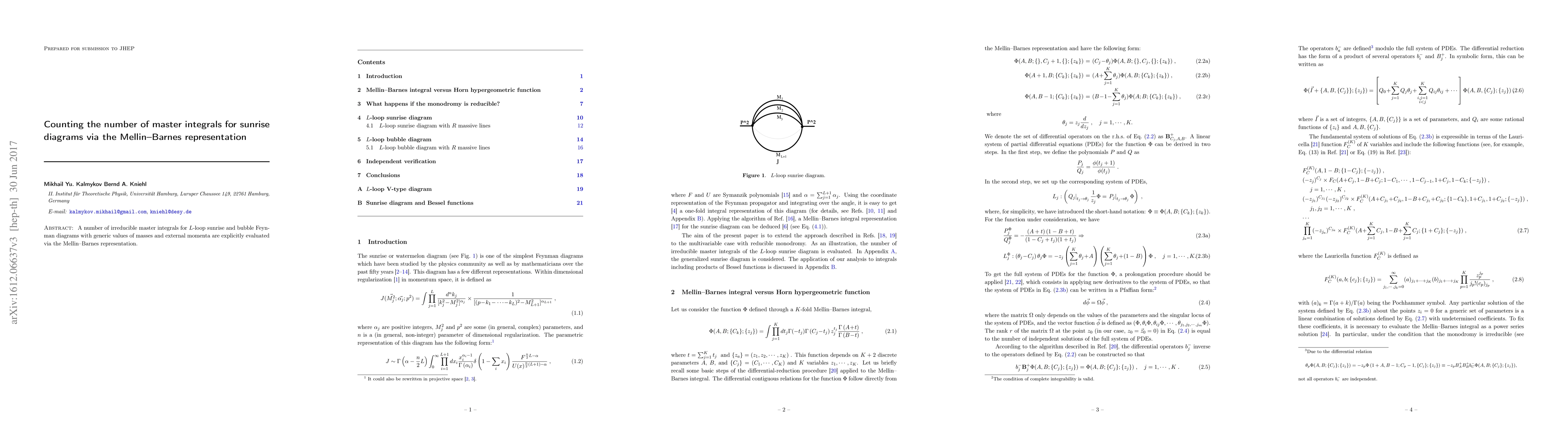 Summary: This paper evaluates irreducible master integrals for L-loop sunrise-type and bubble Feynman diagrams using the Mellin-Barnes representation, providing explicit expressions for these integrals with generic mass and momentum values.