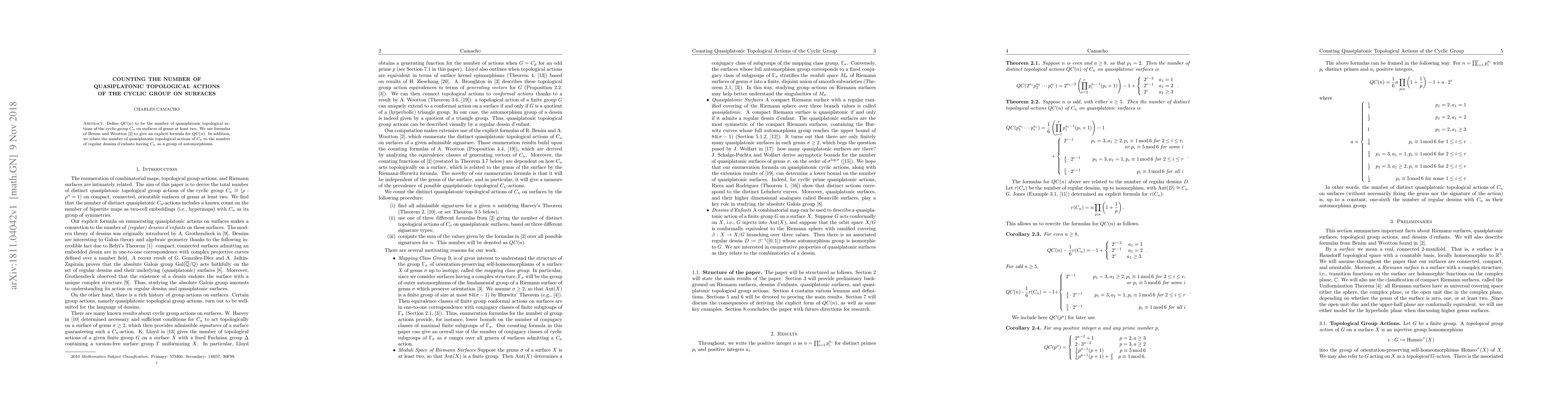 This paper provides an explicit formula for $QC(n)$, the count of quasiplatonic topological actions of the cyclic group $C_n$ on surfaces of genus at least two, using results from Benim and Wootton. It also connects these counts to the number of regular dessins d'enfants with $C_n$ as their automorphism group.