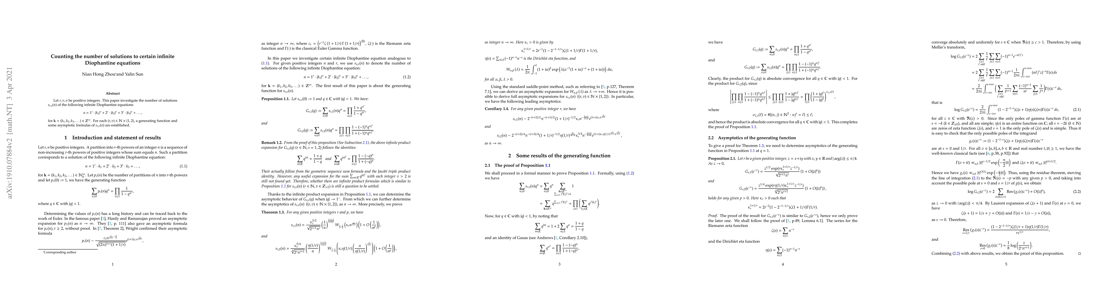 Let $r, v, n$ be positive integers. This paper investigate the number of solutions $s_{r,v}(n)$ of the following infinite Diophantine equations $$ n=1^{r}\cdot |k_{1}|^{v}+2^{r}\cdot |k_{2}|^{v}+3^{r}\cdot |k_{3}|^{v}+\ldots, $$ for ${\bf k}=(k_1,k_2,k_3,\dots)\in\mathbb{Z}^{\infty}$. For each $(r,v)\in\mathbb{N}\times\{1,2\}$, a generating function and some asymptotic formulas of $s_{r,v}(n)$ are established.