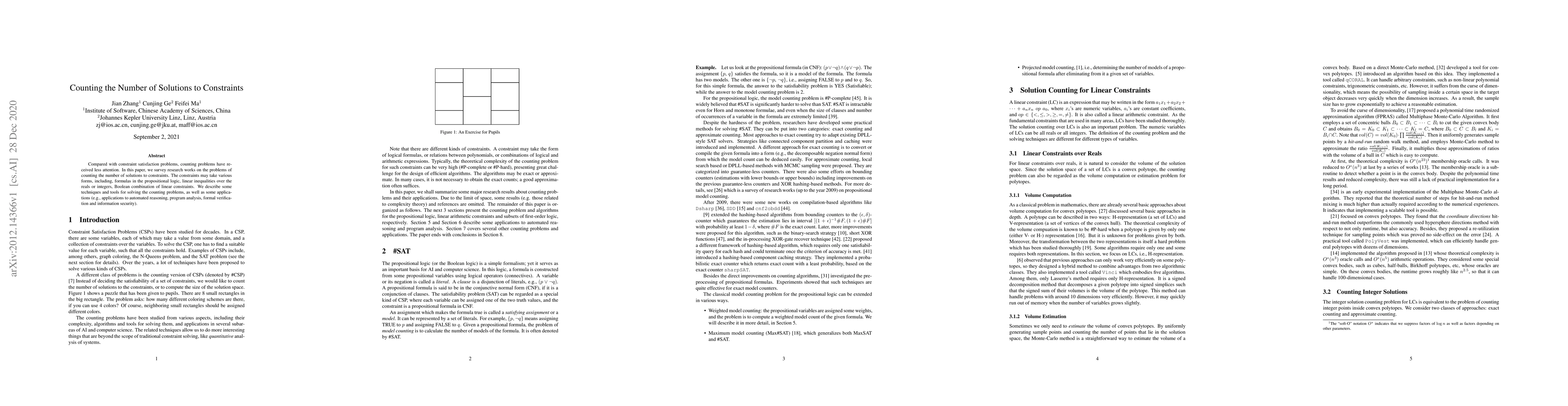 Compared with constraint satisfaction problems, counting problems have received less attention. In this paper, we survey research works on the problems of counting the number of solutions to constraints. The constraints may take various forms, including, formulas in the propositional logic, linear inequalities over the reals or integers, Boolean combination of linear constraints. We describe some techniques and tools for solving the counting problems, as well as some applications (e.g., applications to automated reasoning, program analysis, formal verification and information security).