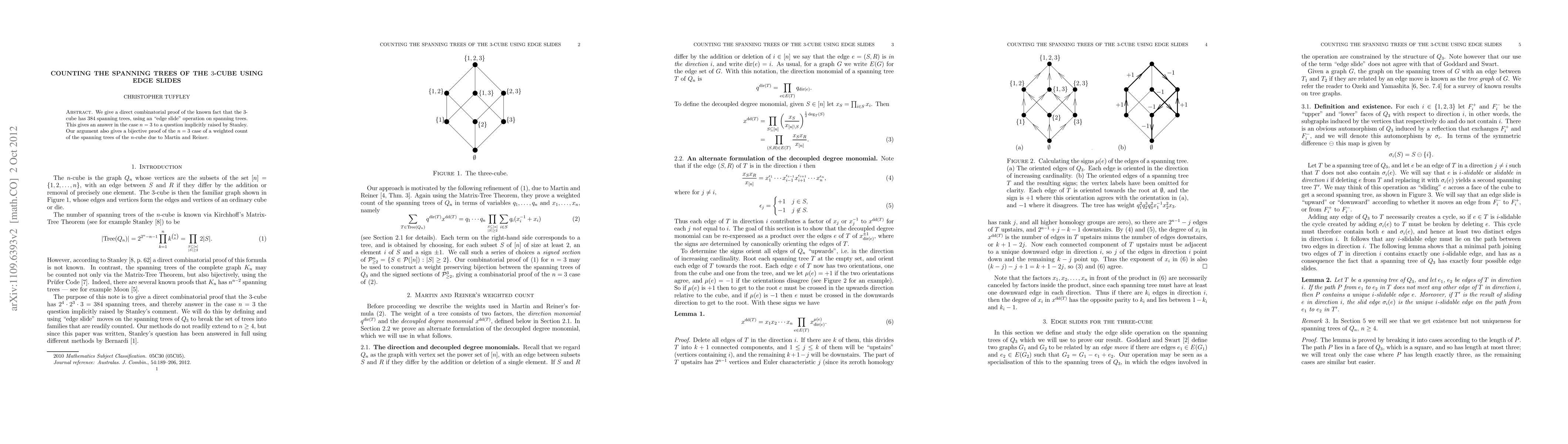 This paper provides a combinatorial proof for the 384 spanning trees of the 3-cube using the "edge slide" operation, answering a question raised by Stanley and offering a bijective proof for the weighted count of spanning trees in the 3-cube.