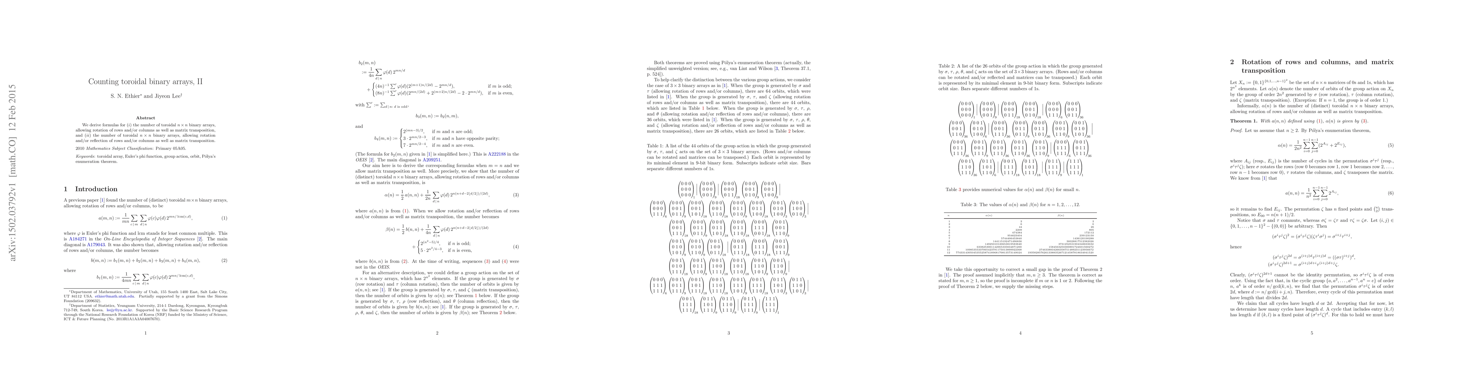 The paper derives formulas for the number of toroidal $n\\times n$ binary arrays, allowing various transformations such as row and column rotations, matrix transposition, and reflections.