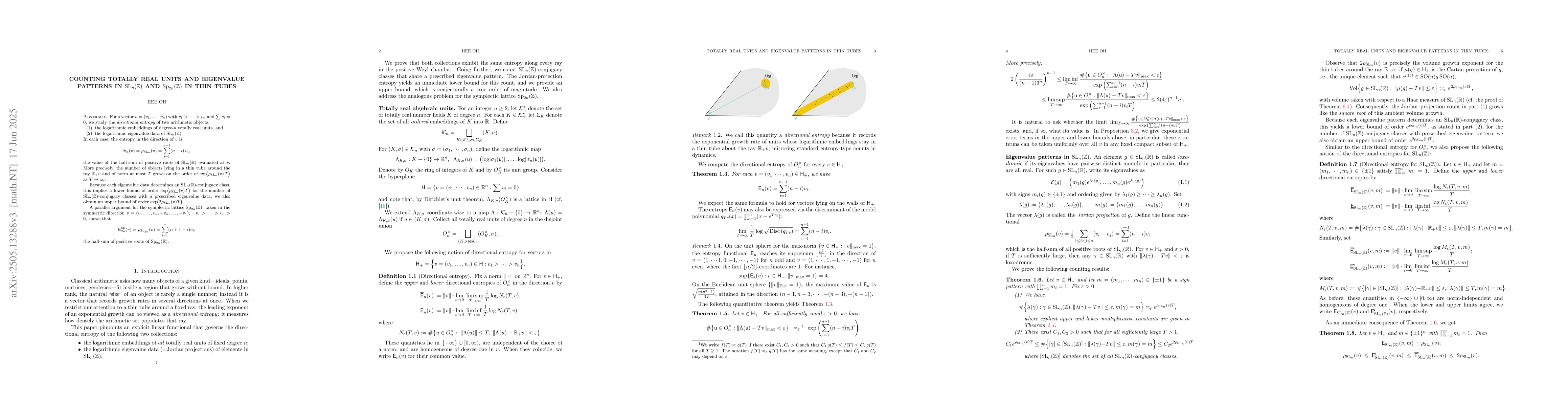 The paper establishes precise asymptotic formulas for the counting functions of totally real units and eigenvalue patterns in SL_n(ℤ) and Sp_{2n}(ℤ) along thin tubes, linking these arithmetic problems to the geometry of the groups.