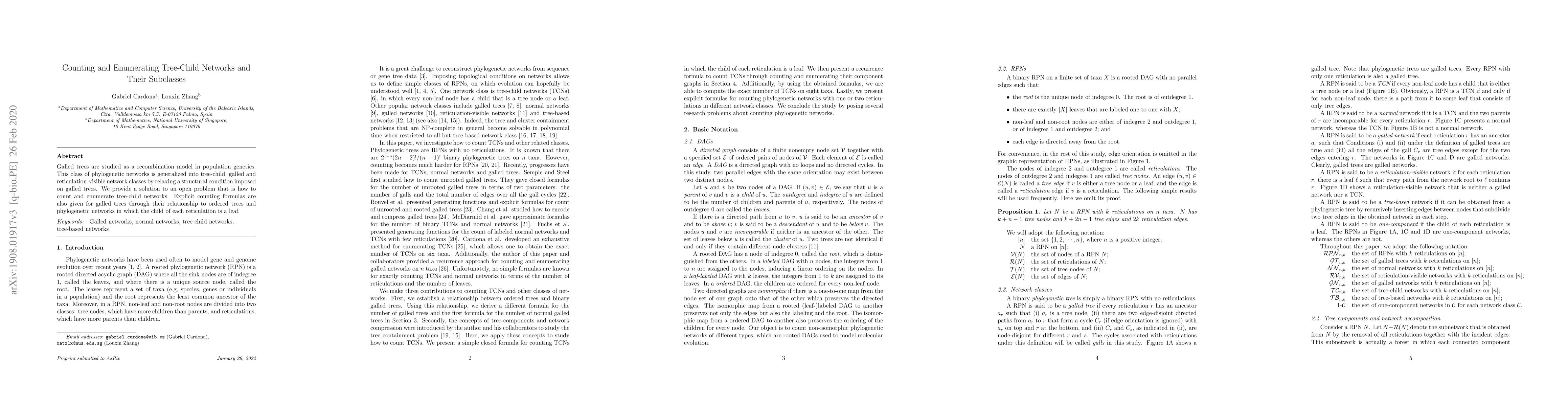 This paper enumerates tree-child networks, a generalization of galled trees in population genetics, by analyzing their component graphs and provides explicit counting formulas for galled trees linked to ordered trees and specific phylogenetic networks.