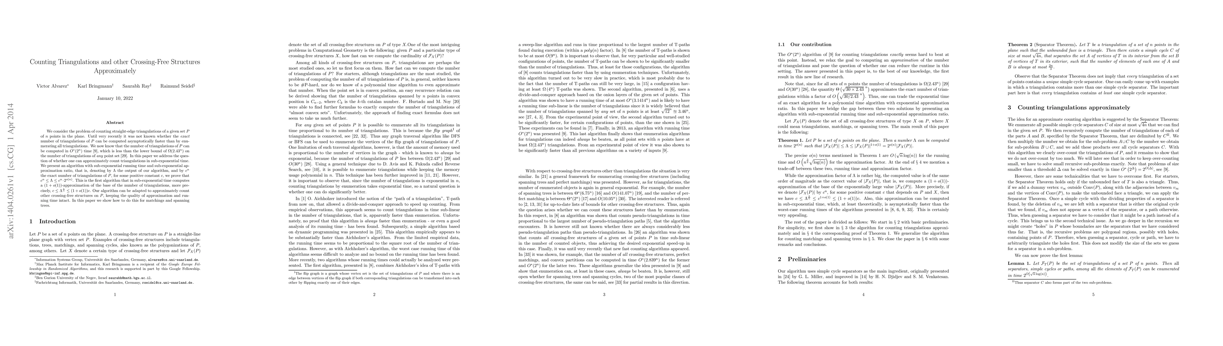 This paper presents an algorithm that approximates the count of triangulations and other crossing-free structures (like matchings and spanning trees) of a set of points in sub-exponential time, achieving a $(1+o(1))$-approximation with running time $O^*(2^{n})$. The algorithm extends to other crossing-free structures while maintaining approximation quality and efficiency.