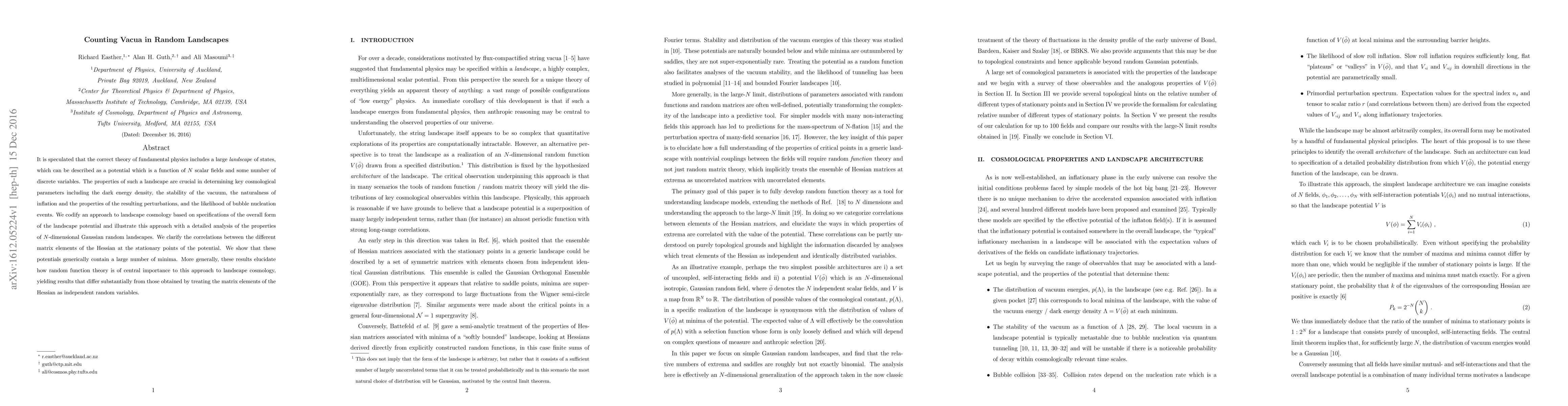 This research explores the concept of a vast landscape of states in fundamental physics, modeled as a potential with N scalar fields and discrete variables. The study focuses on N-dimensional Gaussian random landscapes, clarifying correlations between Hessian matrix elements at stationary points. It reveals these potentials typically have numerous minima, highlighting the significance of random function theory in landscape cosmology, which contrasts with treating Hessian elements as independent random variables.